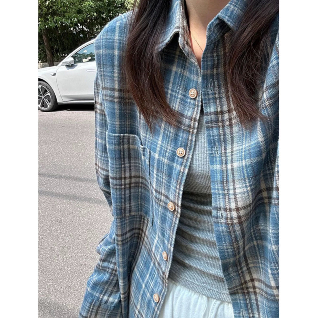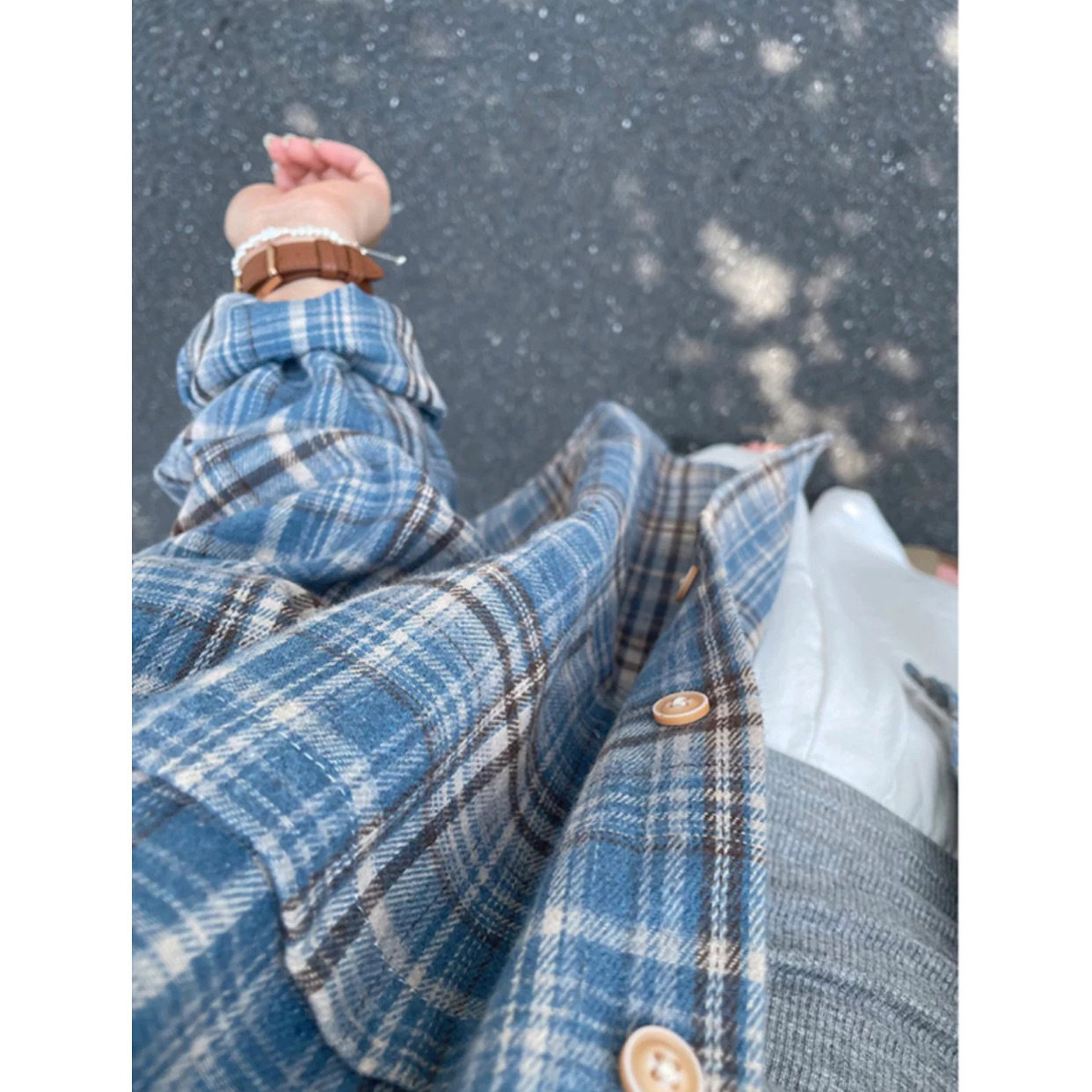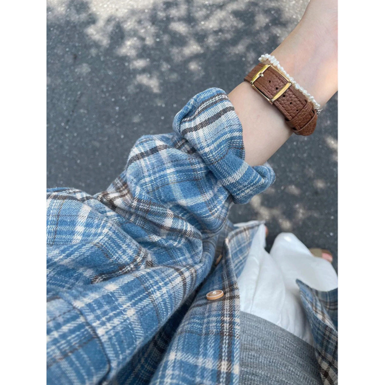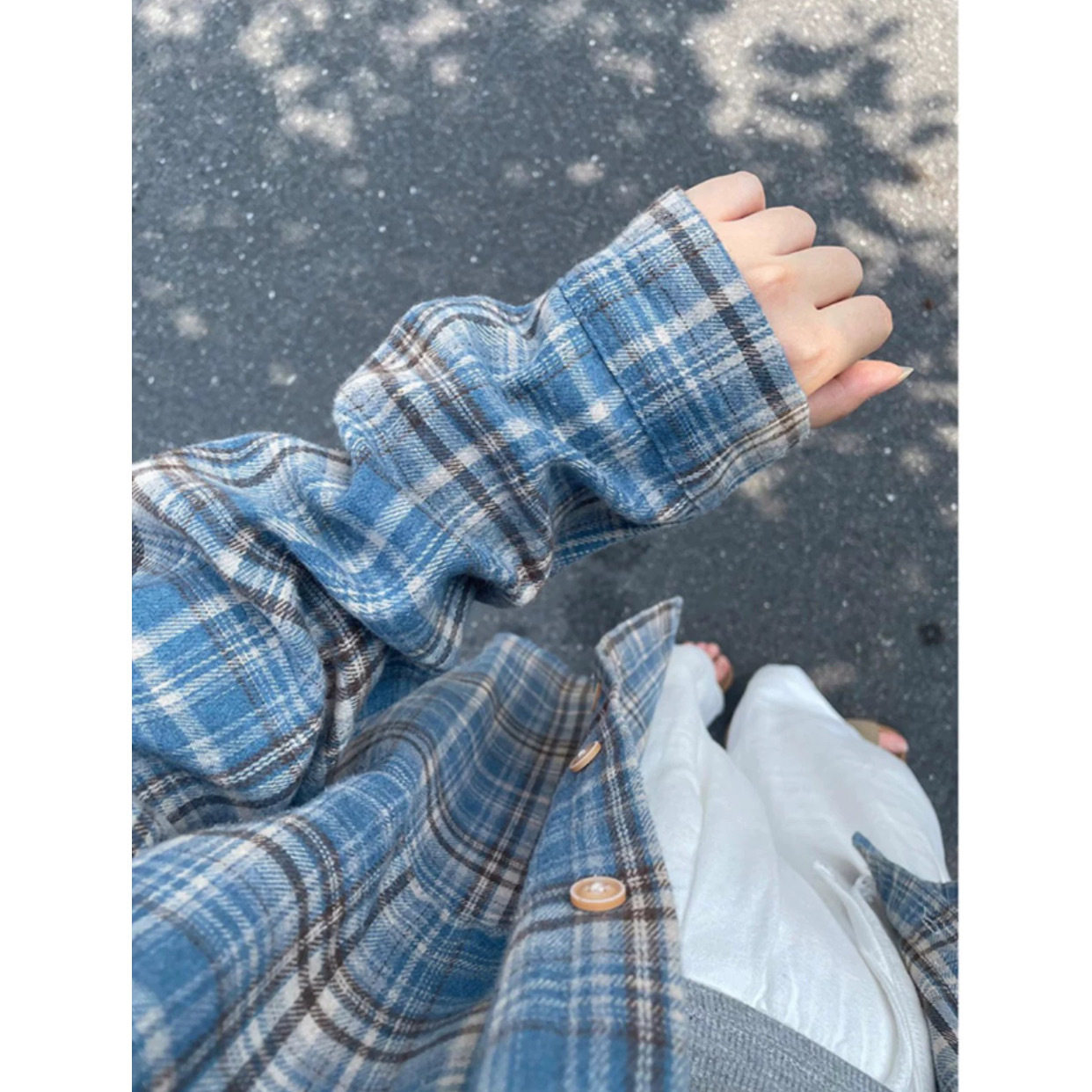 法式蓝色格子磨毛长袖衬衫女春秋宽松oversize原宿风休闲百搭衬衣