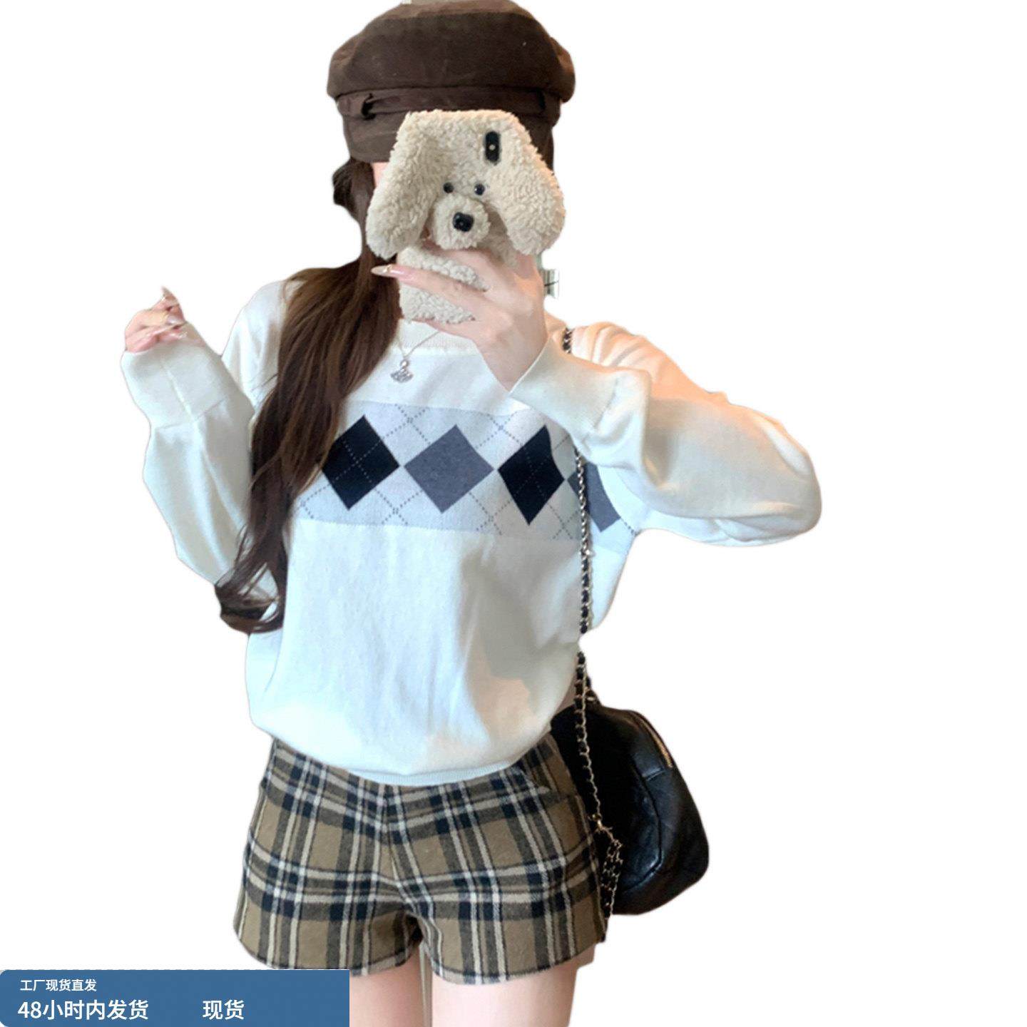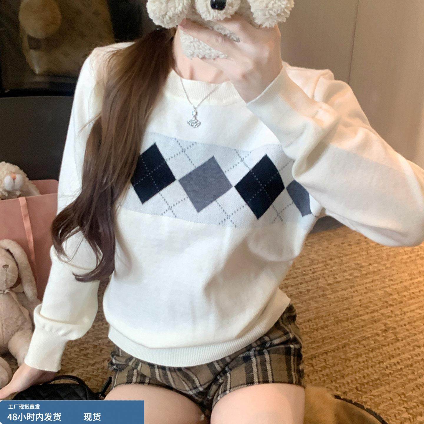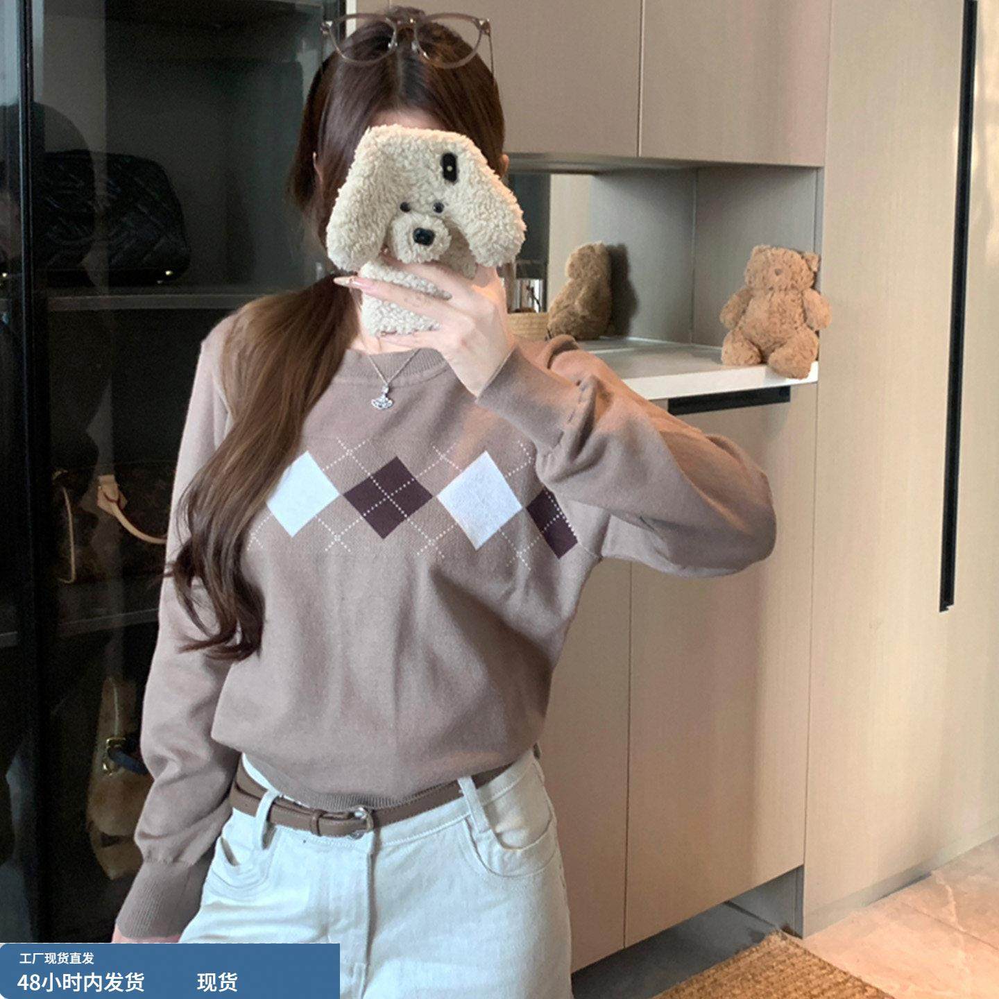 白色复古菱格圆领套头长袖毛衣针织衫女秋冬季休闲宽松韩系上衣棕