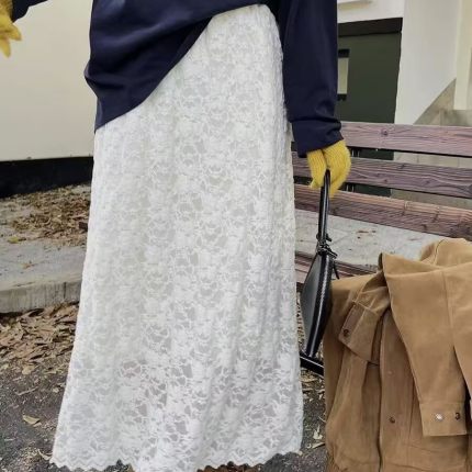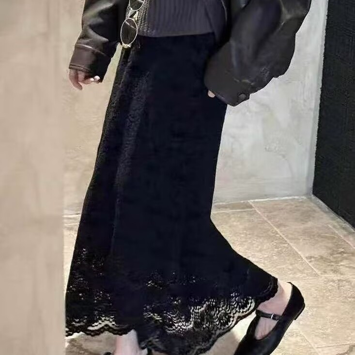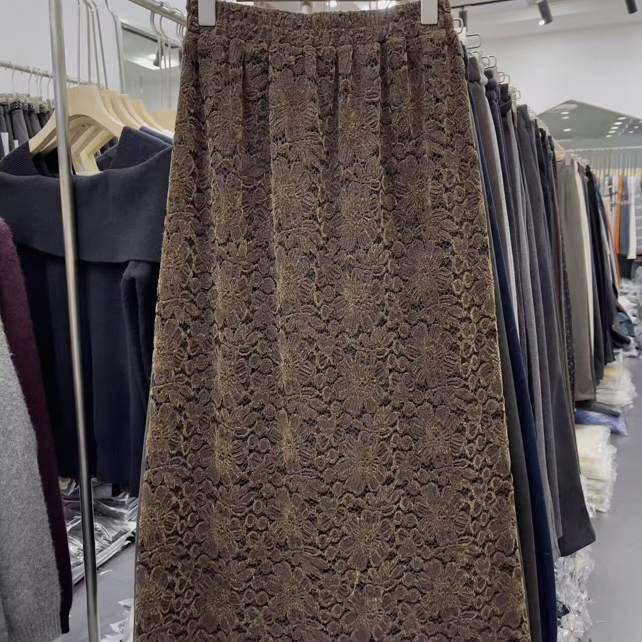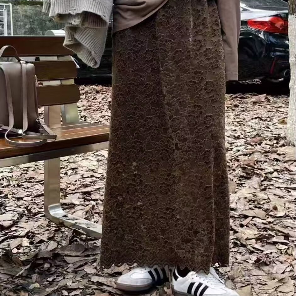 蕾丝半身裙秋冬新磨毛内里高腰显瘦后开叉长裙温柔风裙子特0.43