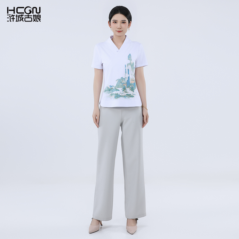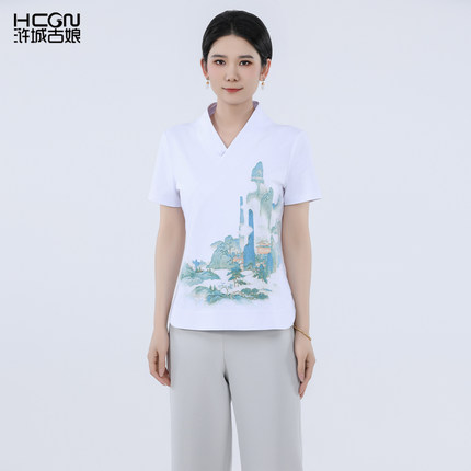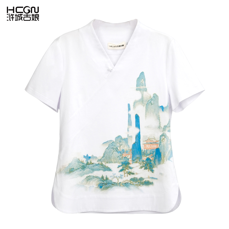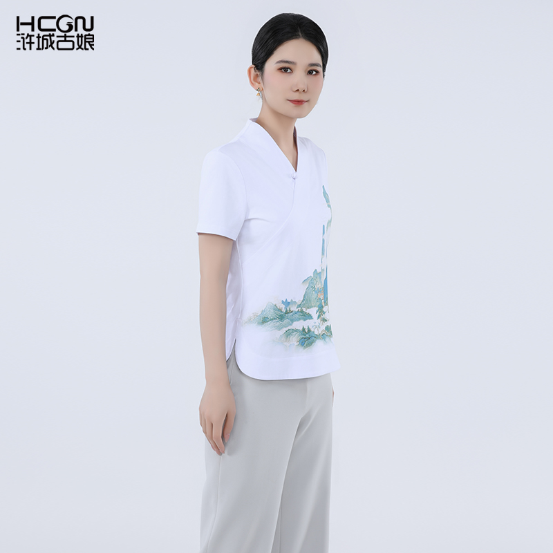 中国风夏季山水印花简洁百搭V领棉质短袖减龄通勤女士印花T恤上衣