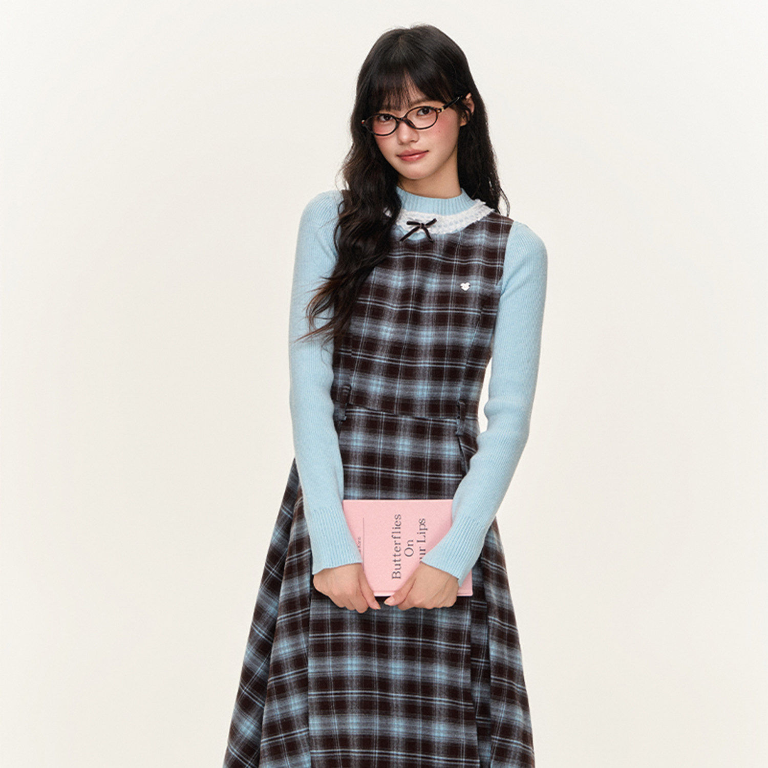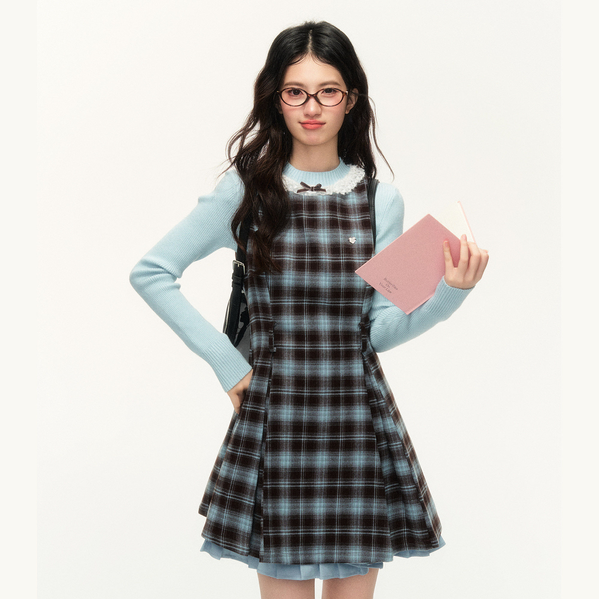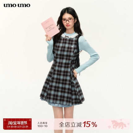 umoumo乌蘑甜美收腰复古蓝棕格纹拼接背心裙无袖A字洋装套装