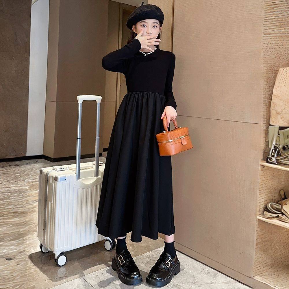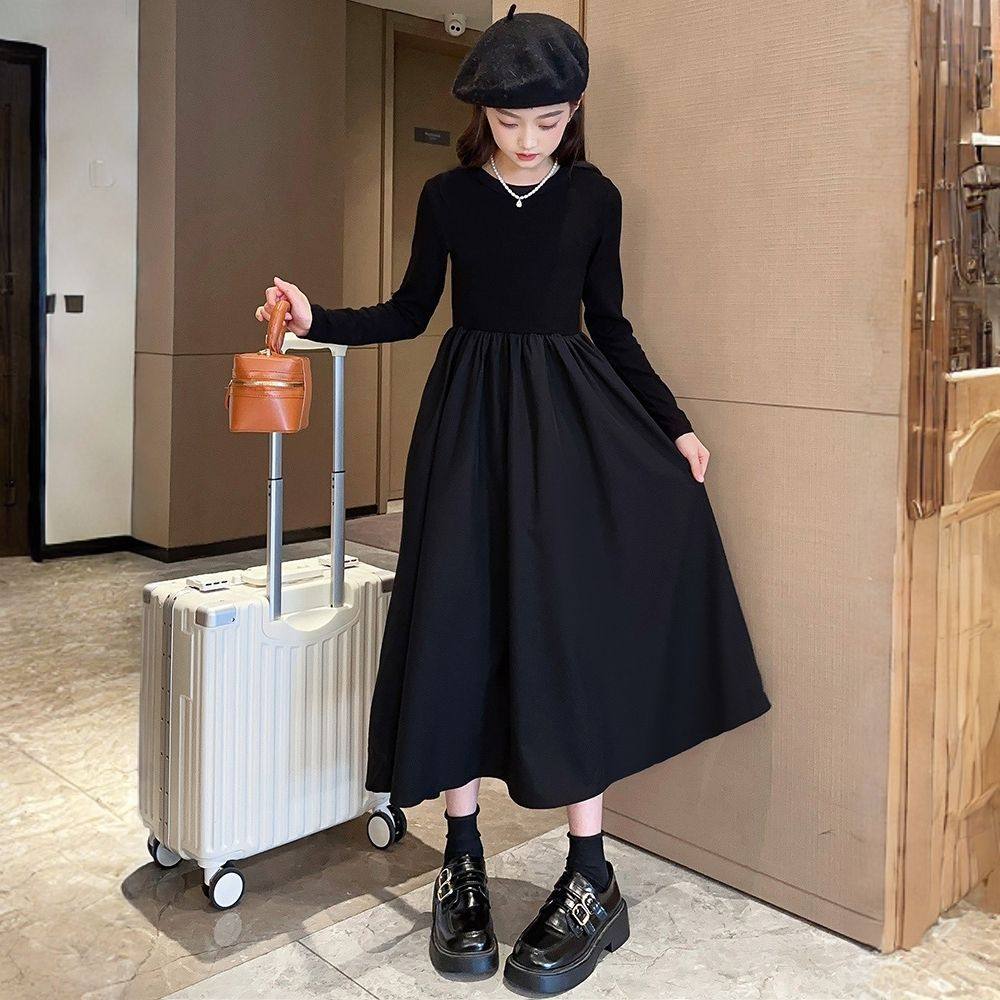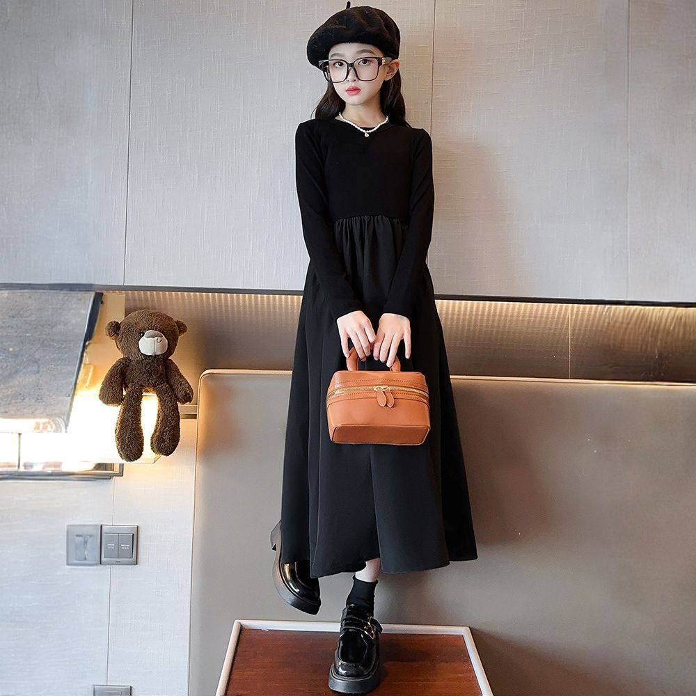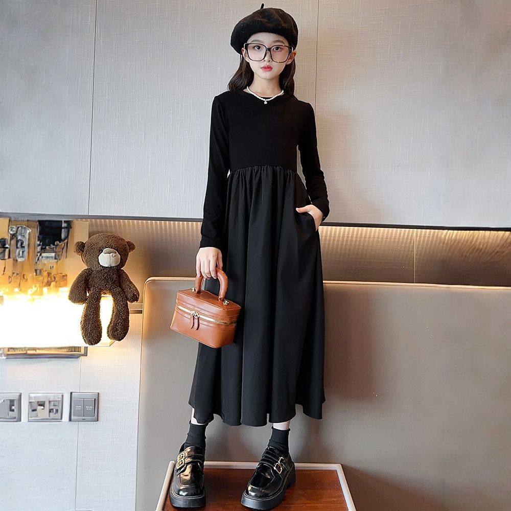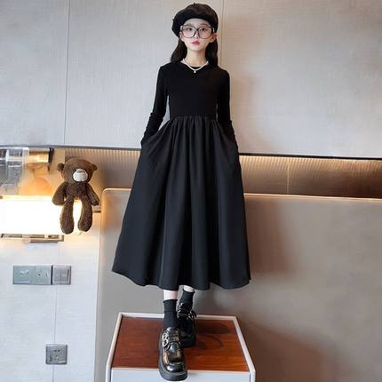 女童连衣裙秋季儿童小黑裙休闲长裙女大童洋气大摆裙时髦长袖裙子