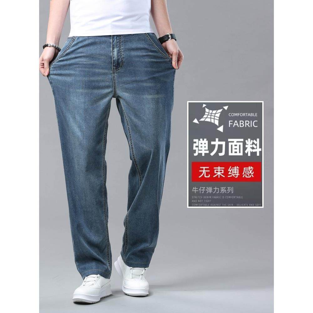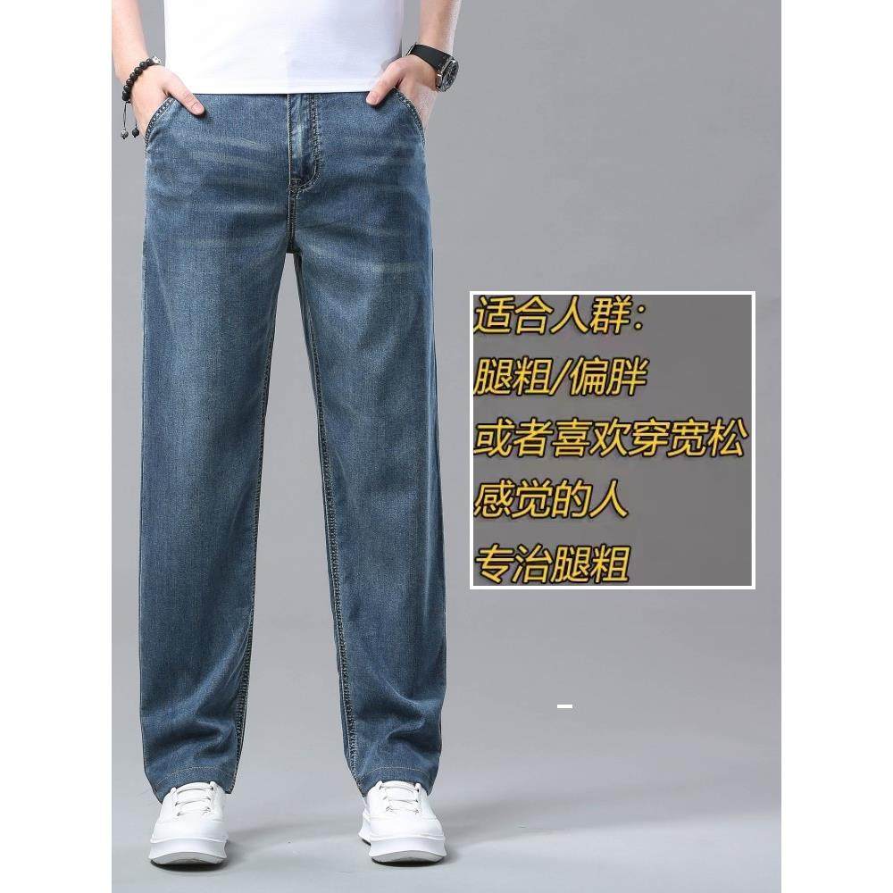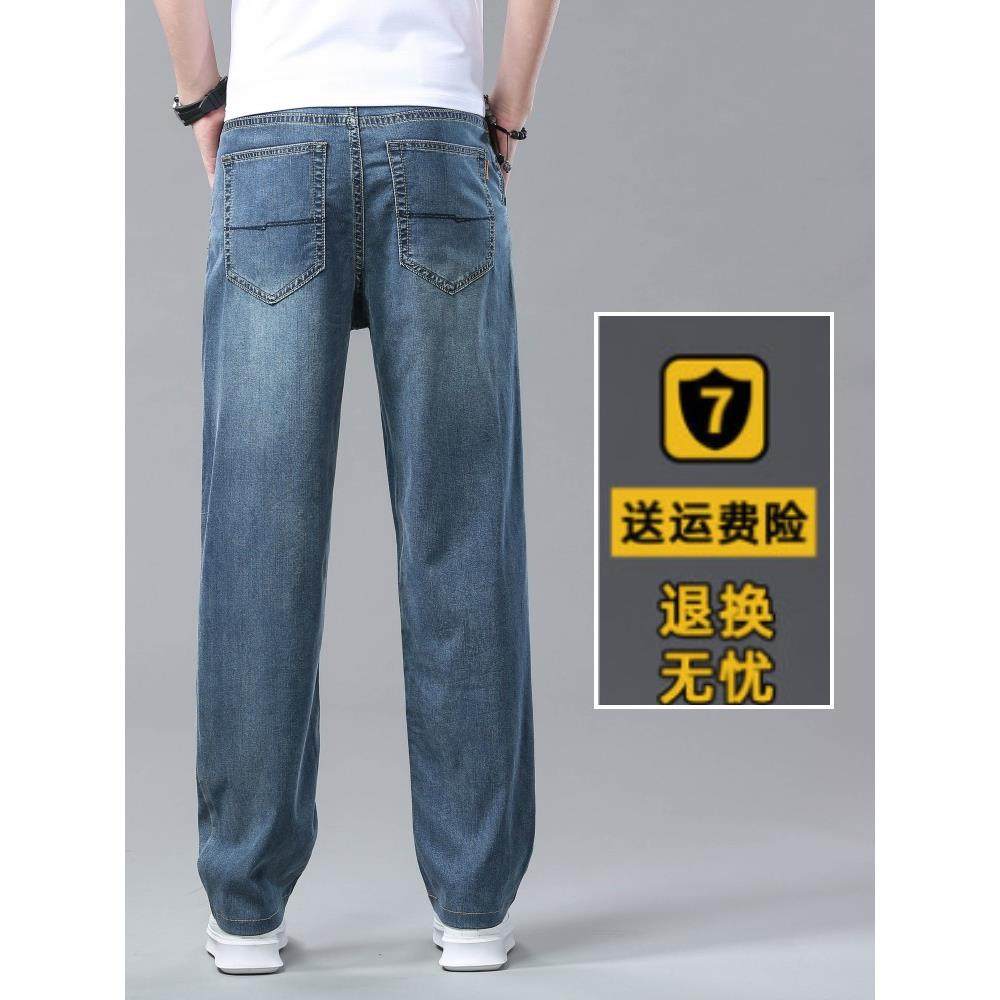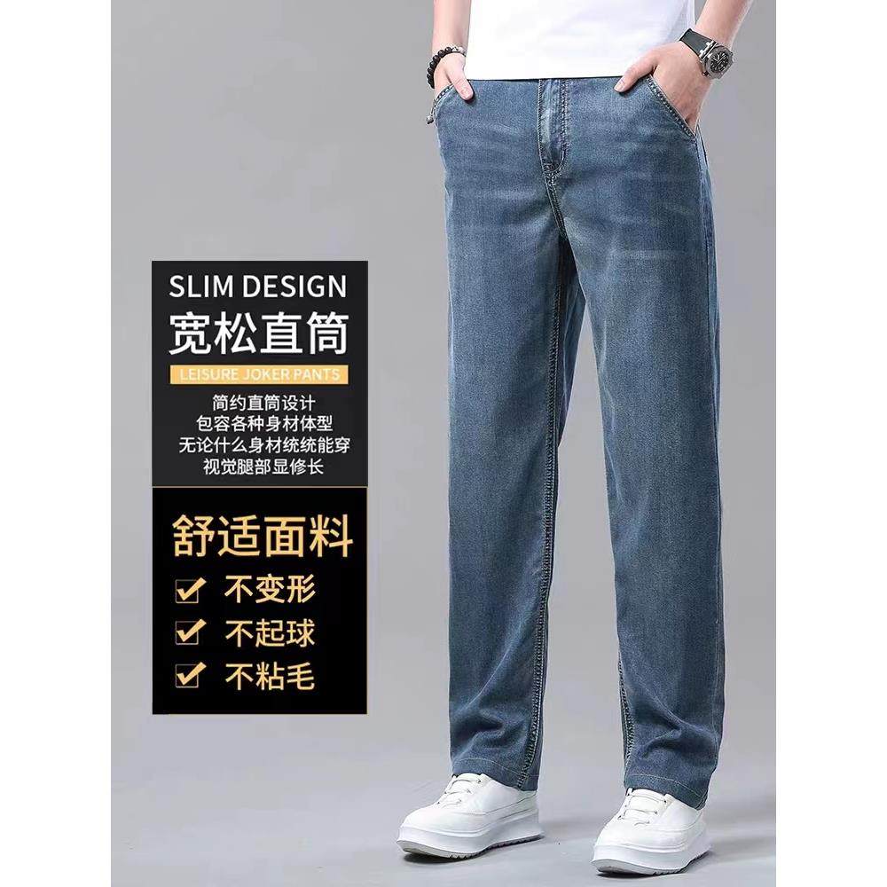 高端天丝牛仔裤男士宽松直筒美式复古蓝斜口袋夏季超薄款冰丝裤子
