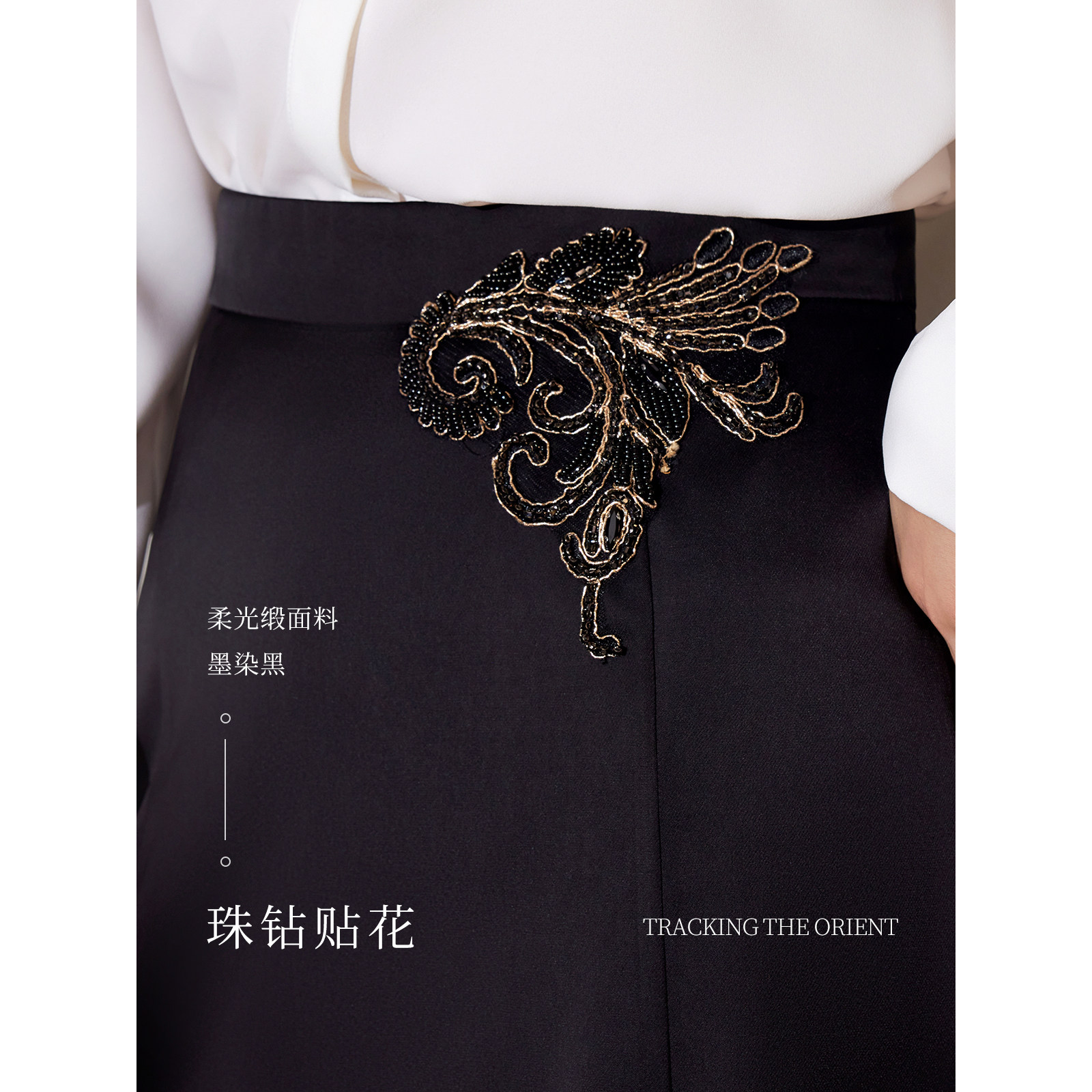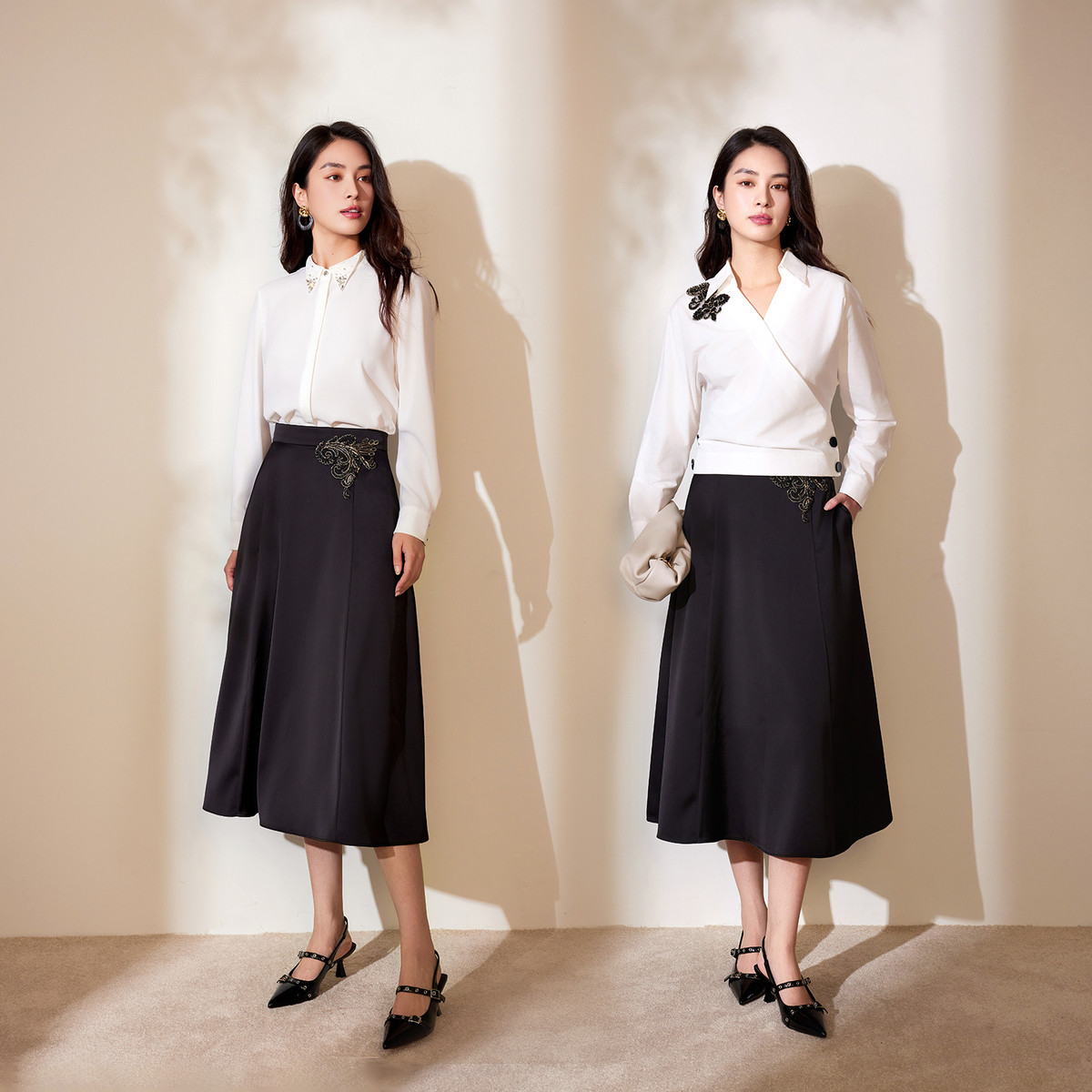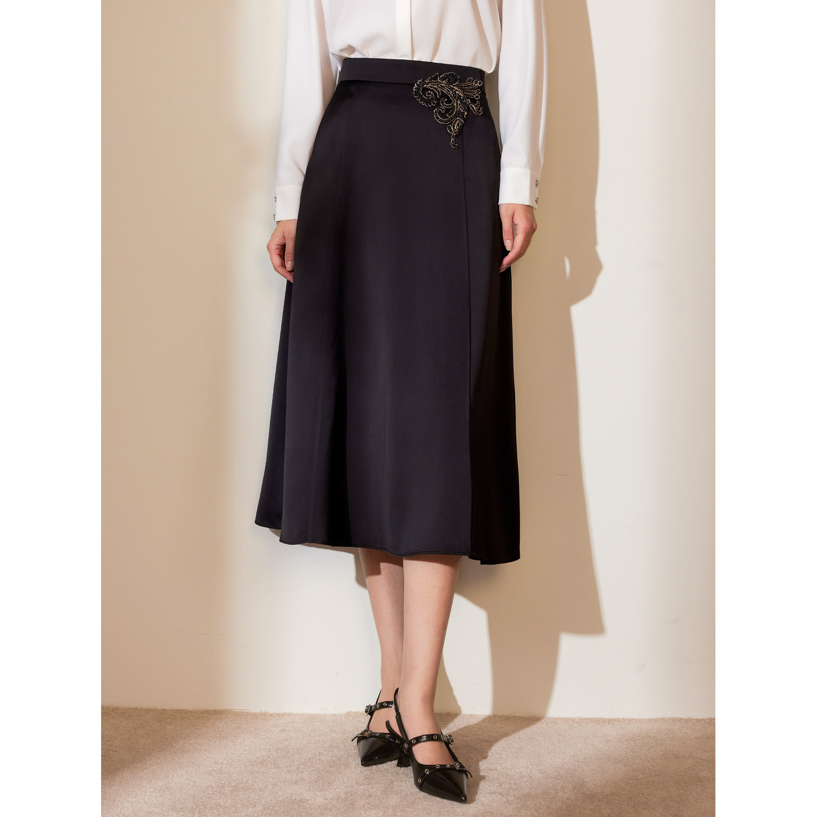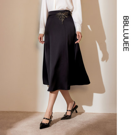 【匠心工艺】BBLLUUEE/粉蓝衣橱2025秋新款光泽珠钻贴花A字半身裙