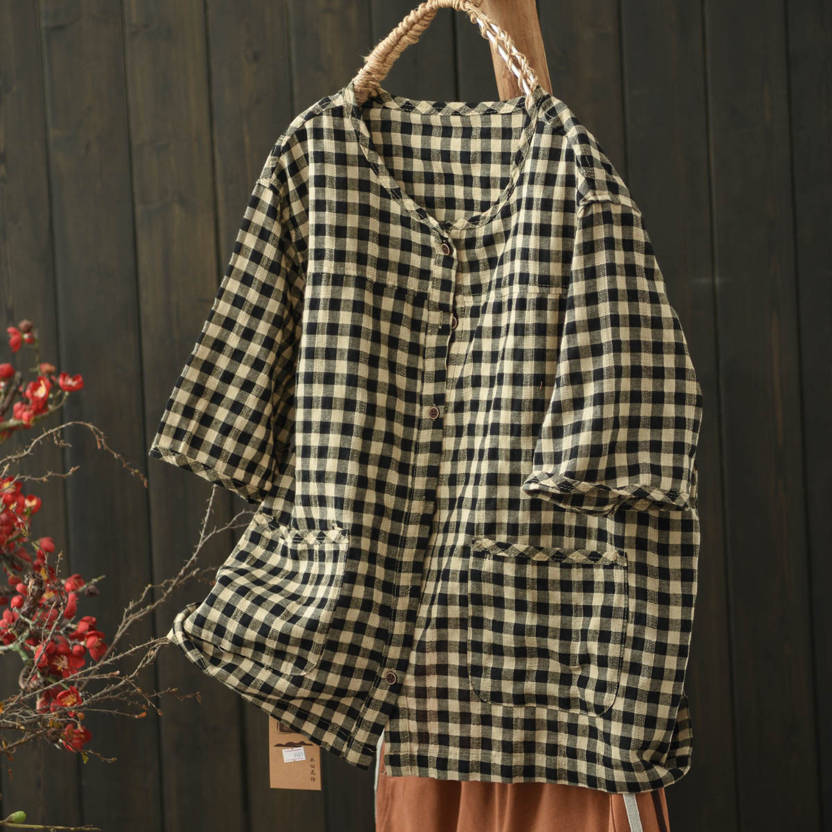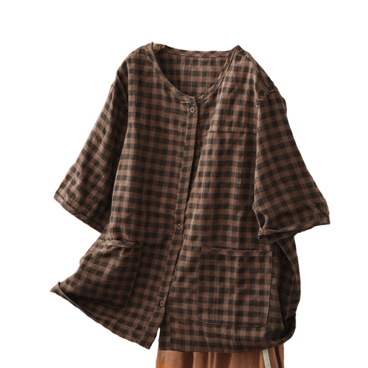 默念文艺森女格子圆领系扣棉麻衬衫女短袖夏宽松大码透气上衣打底
