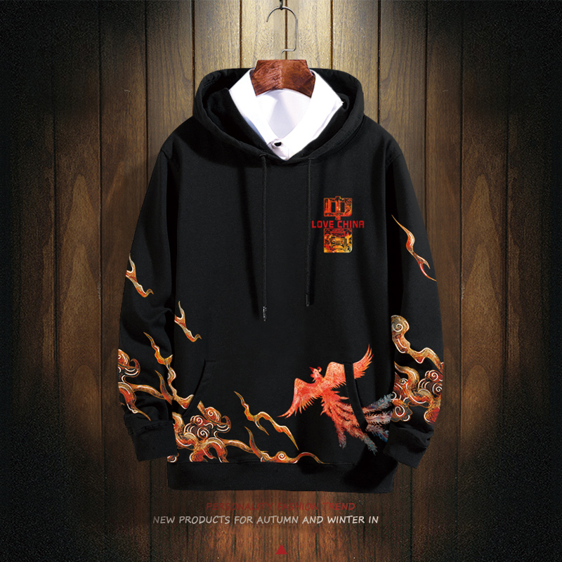 国潮连帽卫衣男士秋冬款凤凰印花上衣大码加肥中国风外套加绒加厚