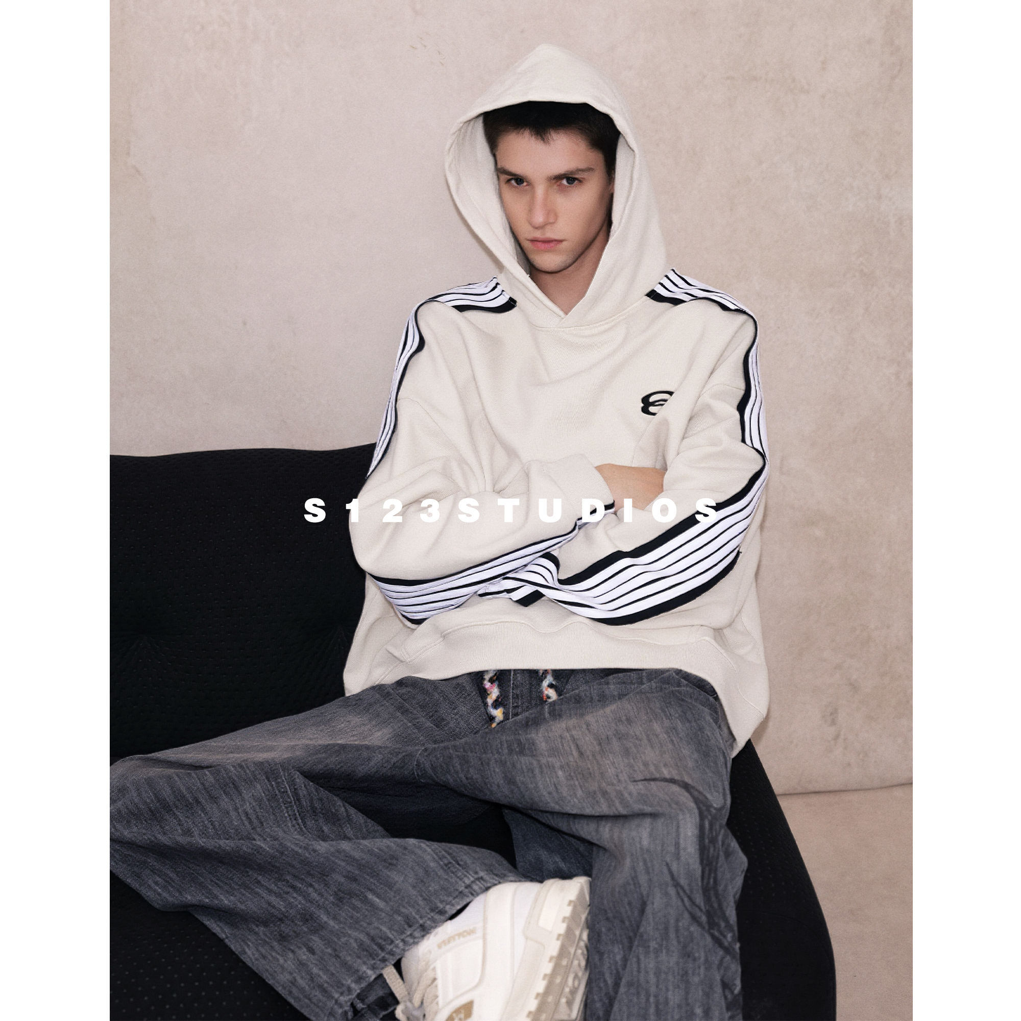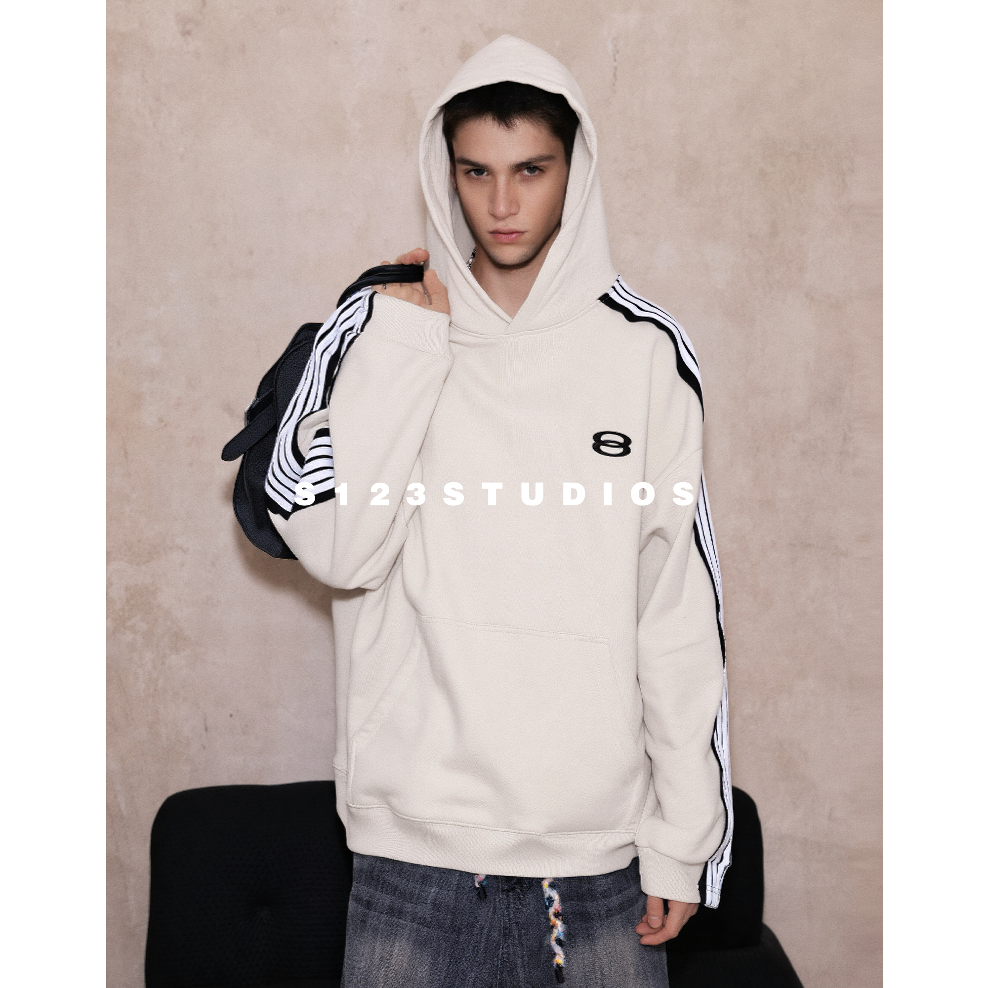 S123法国巴黎绒撞色条纹拼接字母刺绣连帽卫衣男宽松百搭外套上衣