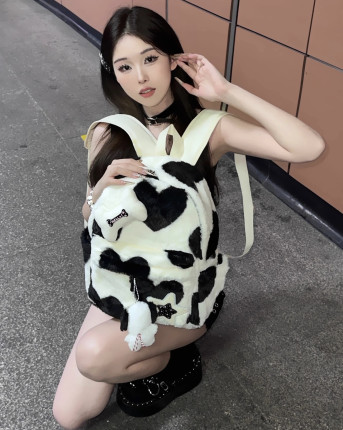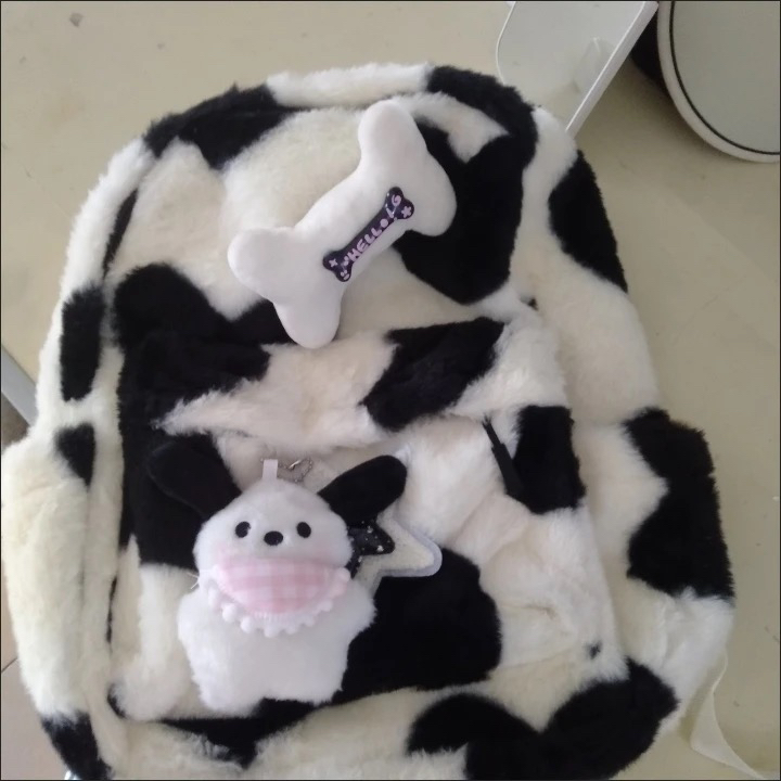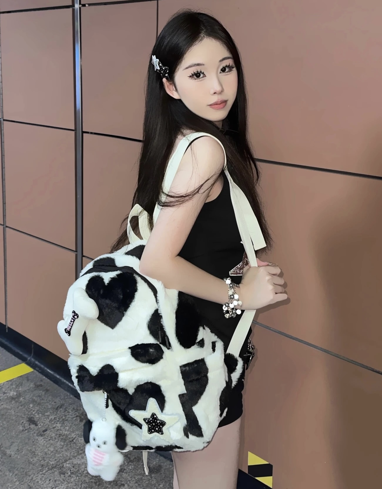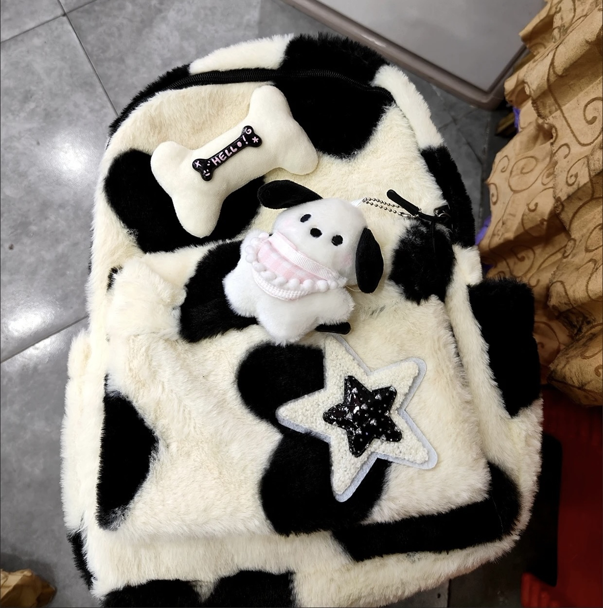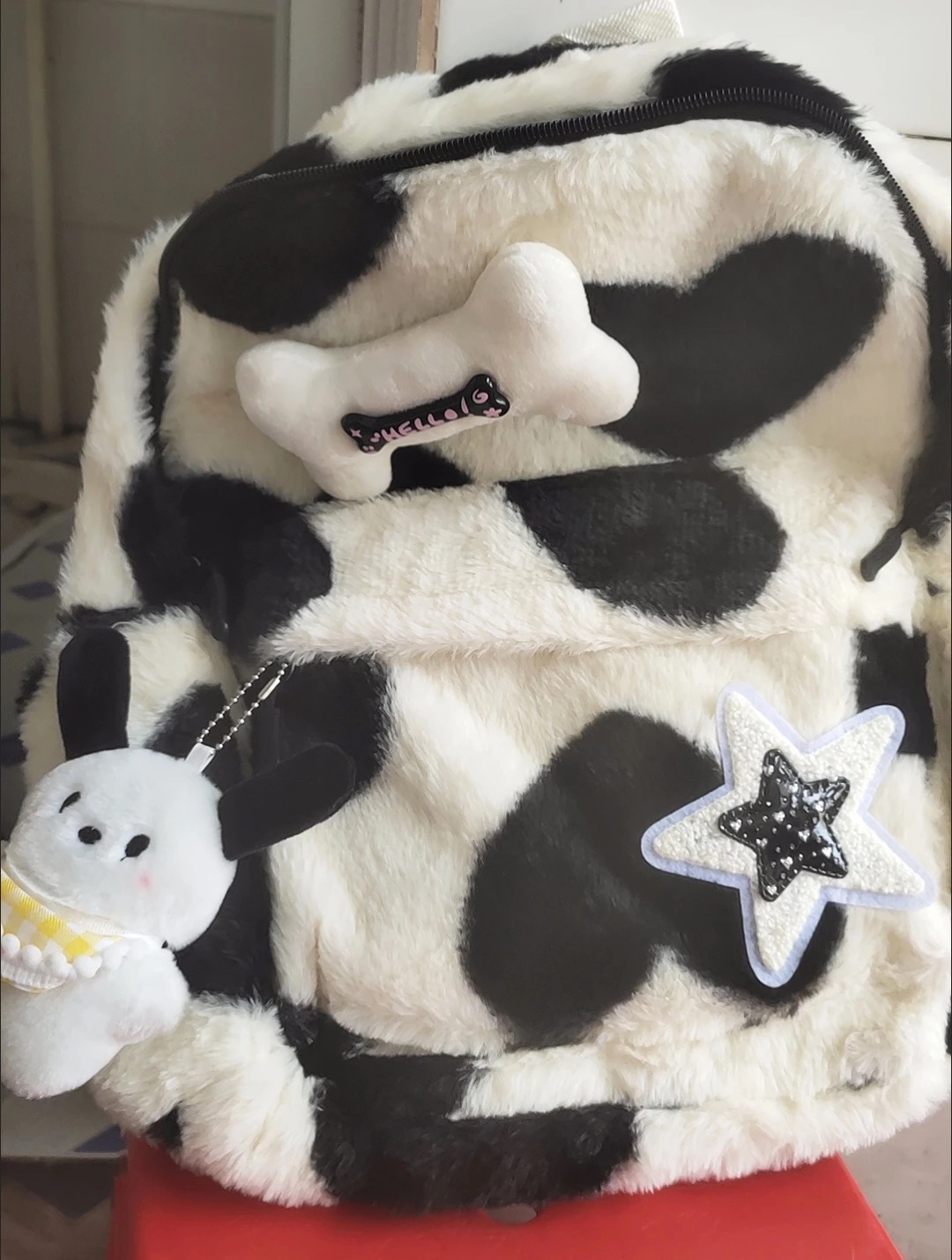 原创秋冬可爱高颜值背包奶牛星星少女毛绒大容量小众双肩包书包