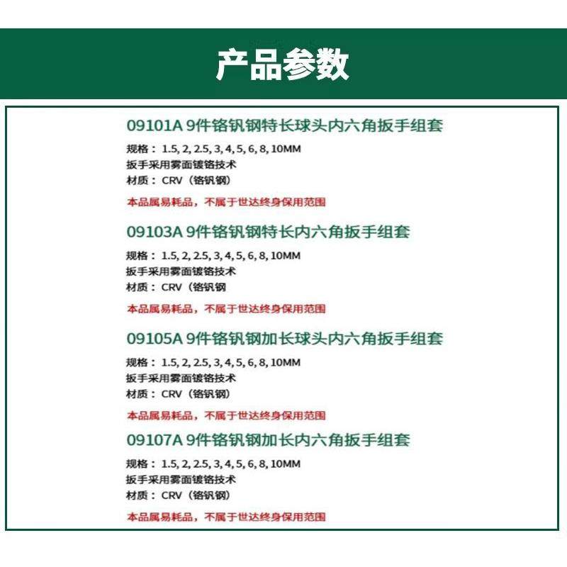 世达9件铬钒钢球头内六角扳手组套09101A/09103A 09105A 09107A