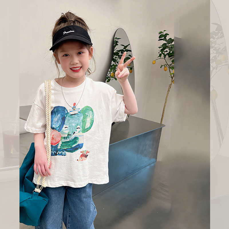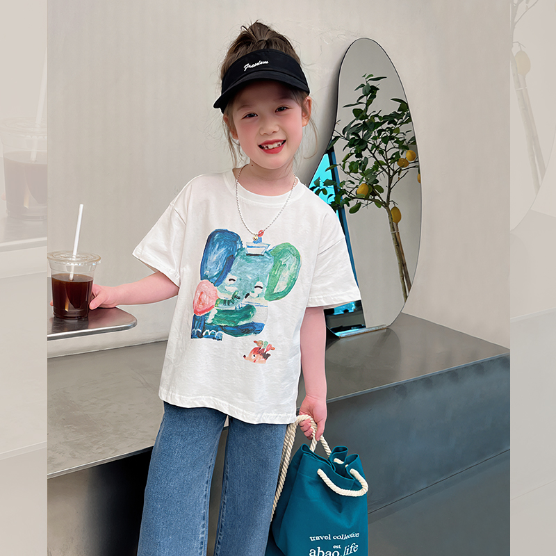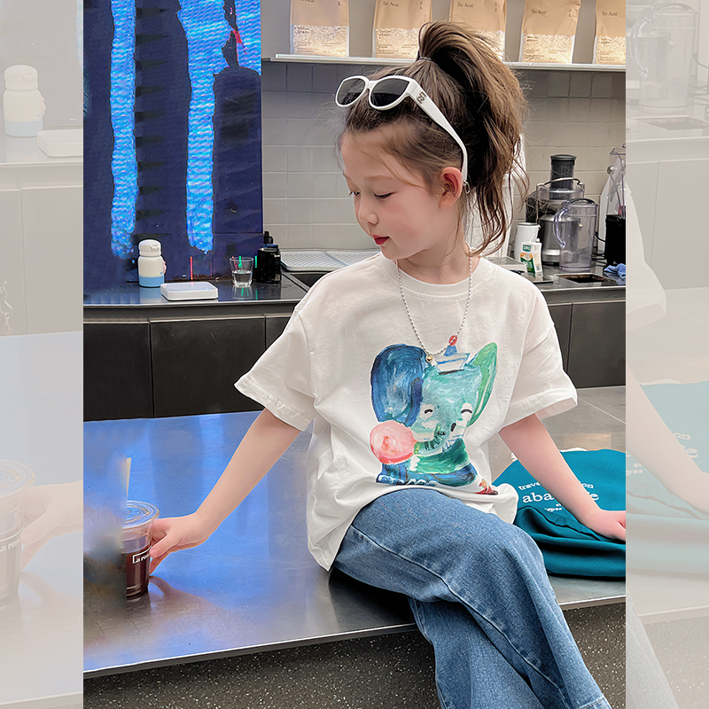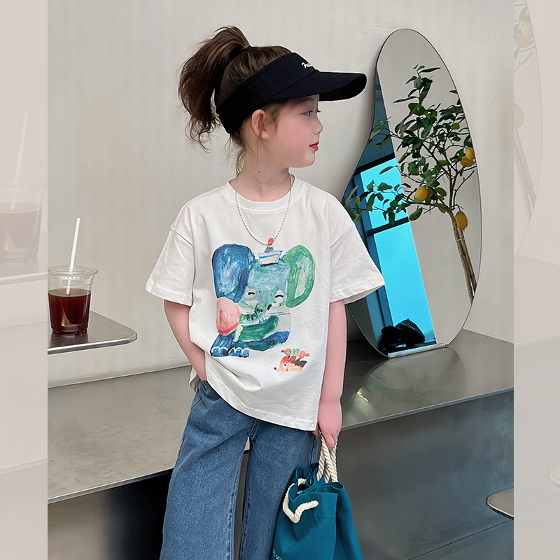 纯棉儿童短袖上衣女童落肩白t恤大童装洋气中袖女孩2025夏装新款