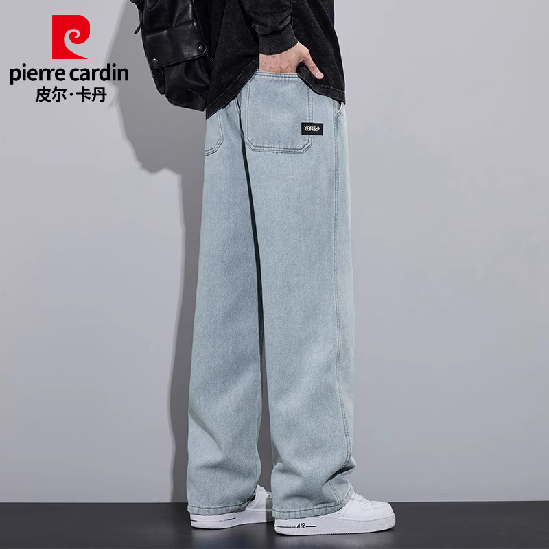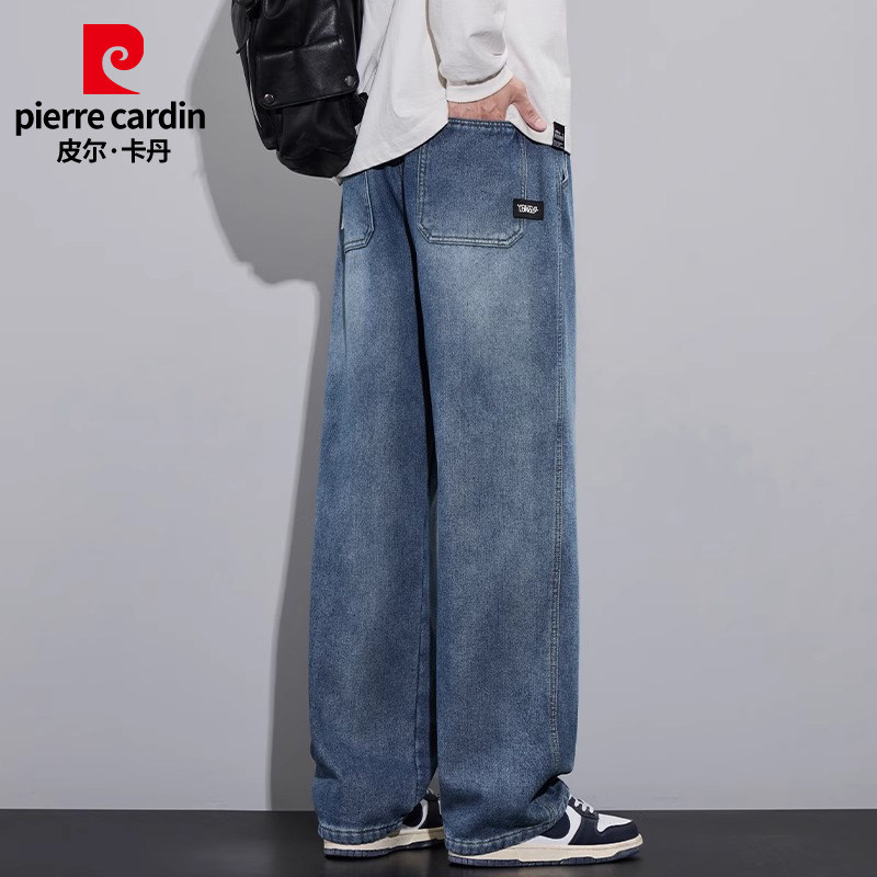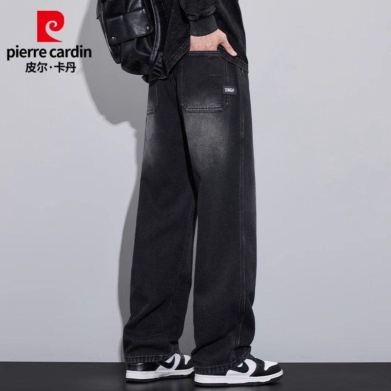 皮尔卡丹秋冬季牛仔裤男士美式高街阔腿宽松直筒休闲加绒厚款裤子