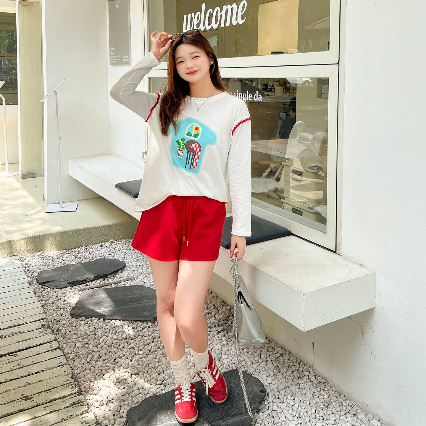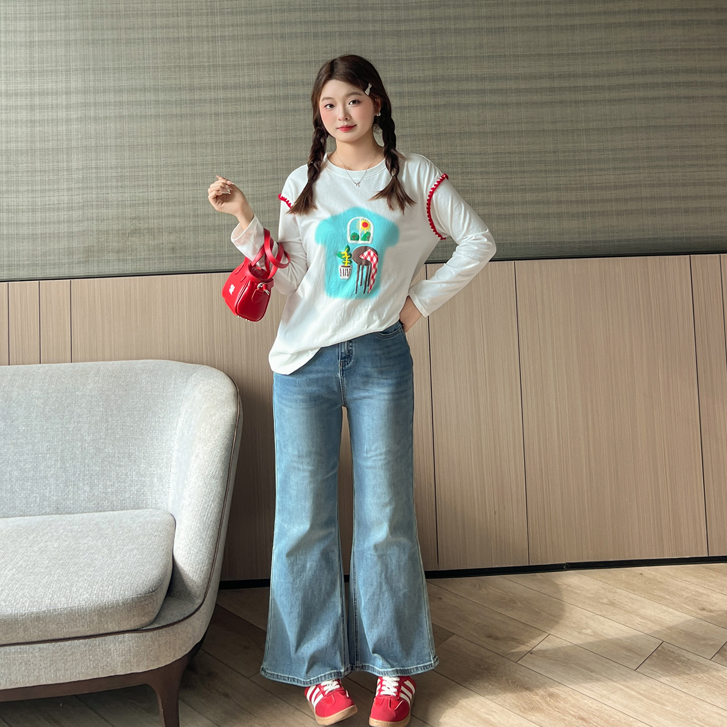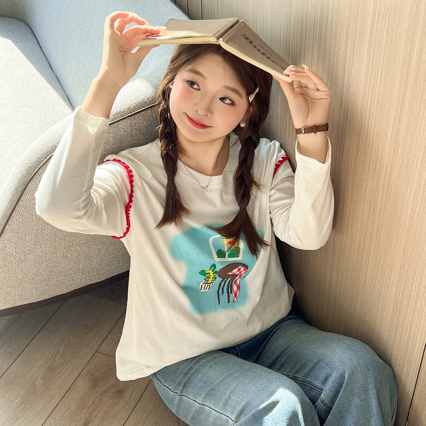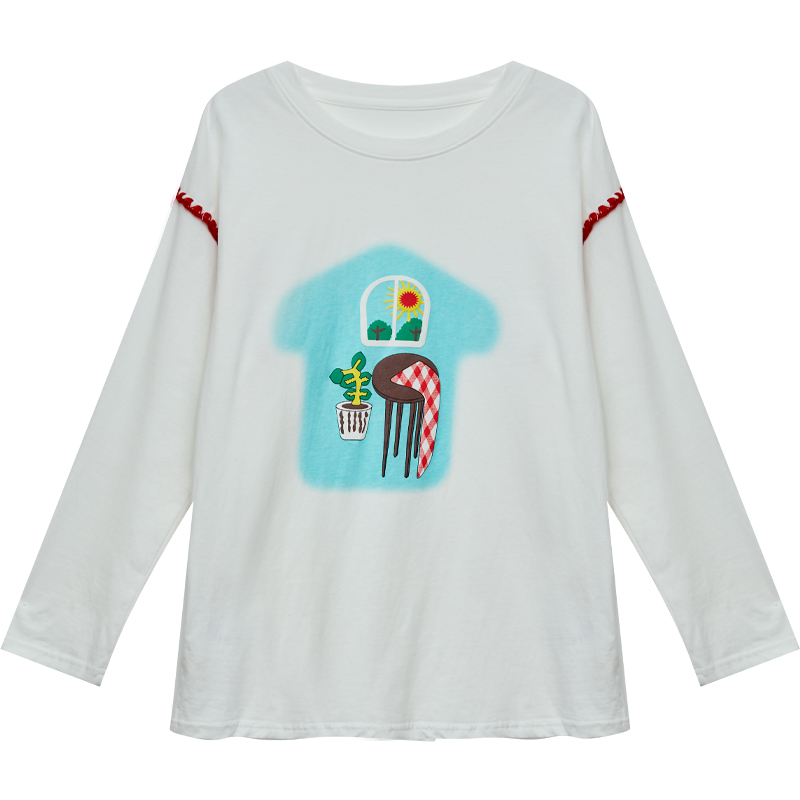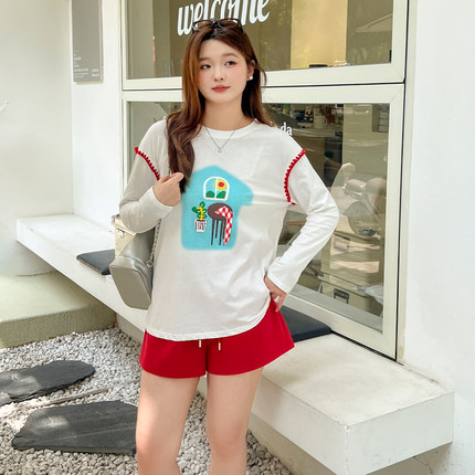 大码百分百女装微胖mm秋宽松上衣美式印花贝壳绣白色打底T恤