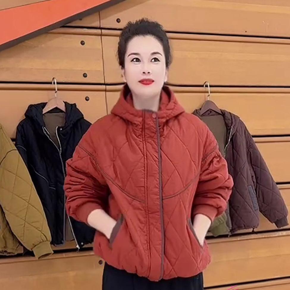 时尚菱形格小棉服女士秋冬新款中年妈妈宽松百搭休闲加厚棉衣外套