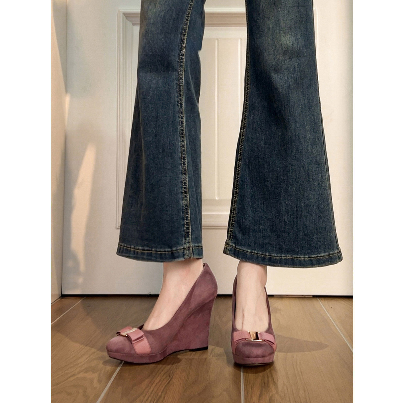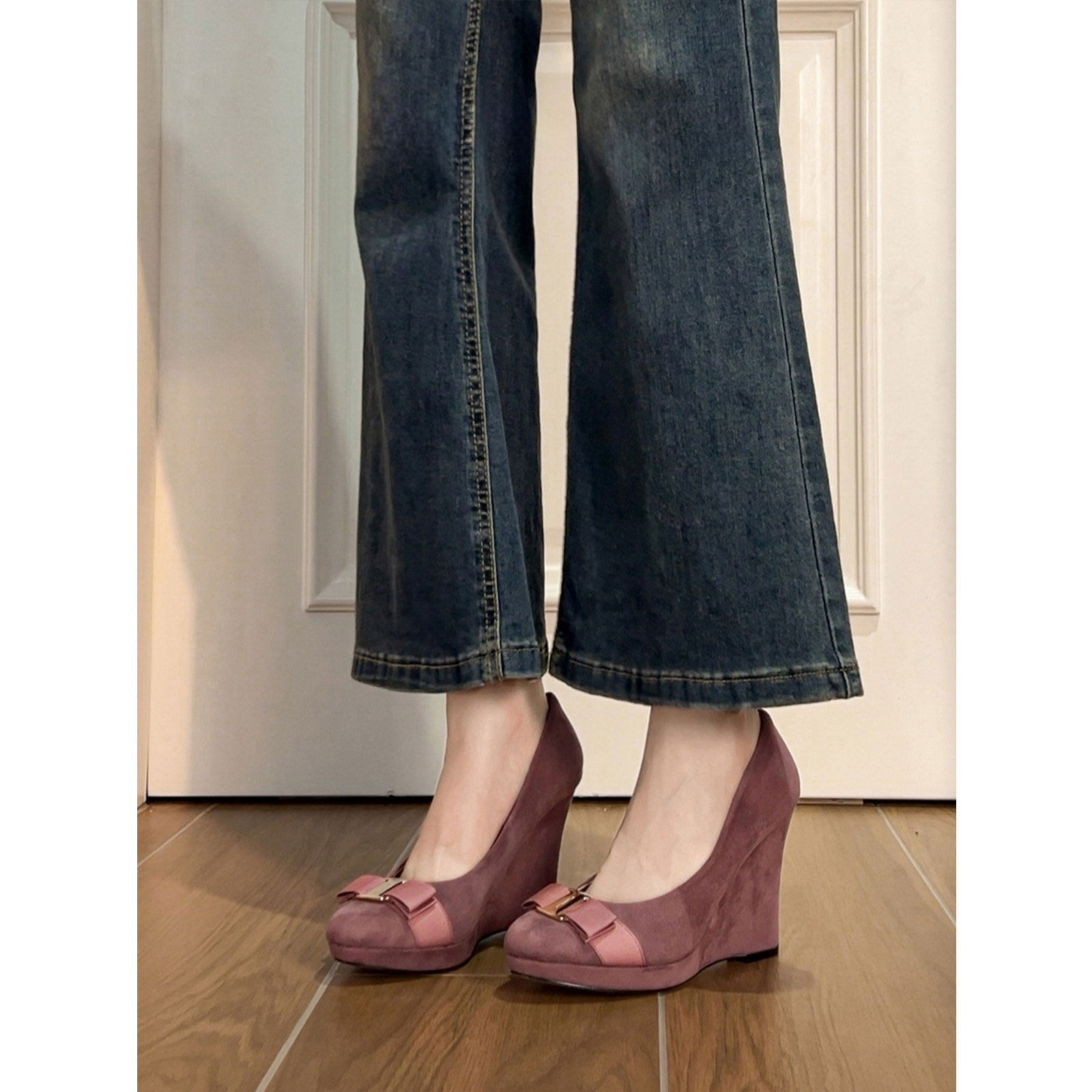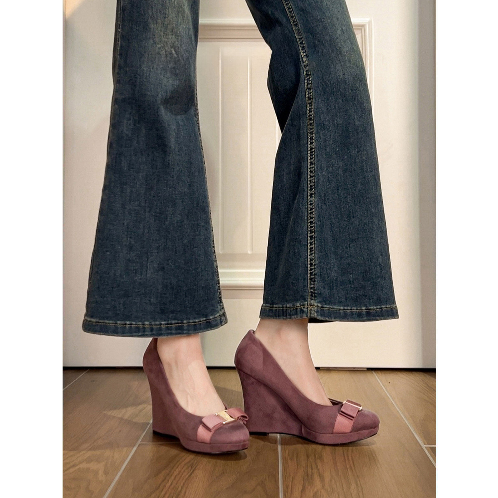 法式蝴蝶结内增高坡跟高跟单鞋