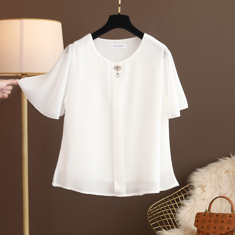 大码雪纺衫圆领T恤短袖新款宽松遮肉200斤喇叭袖妈妈装薄上衣女夏