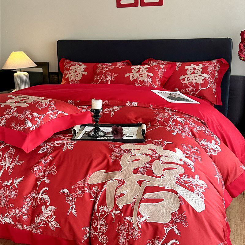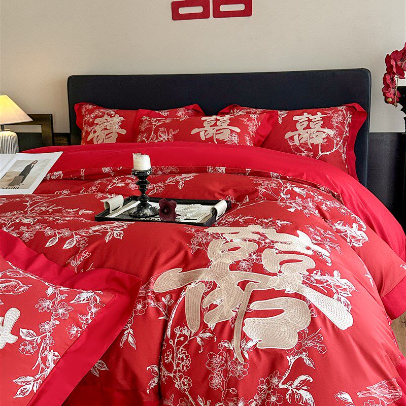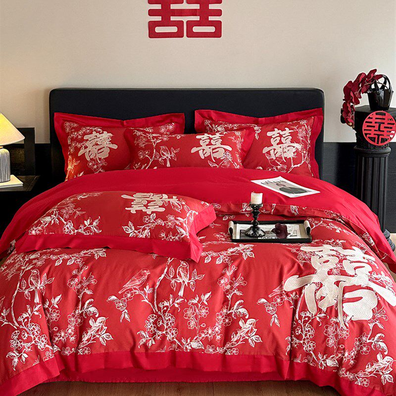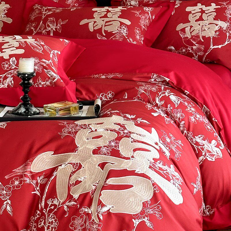 高档中式大结g婚四件套红色印花被套备婚床单婚庆床上用品