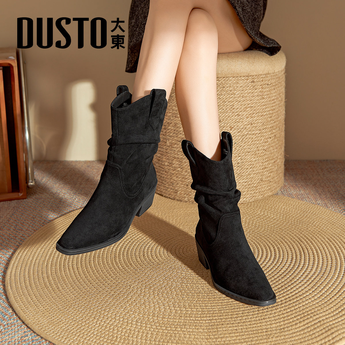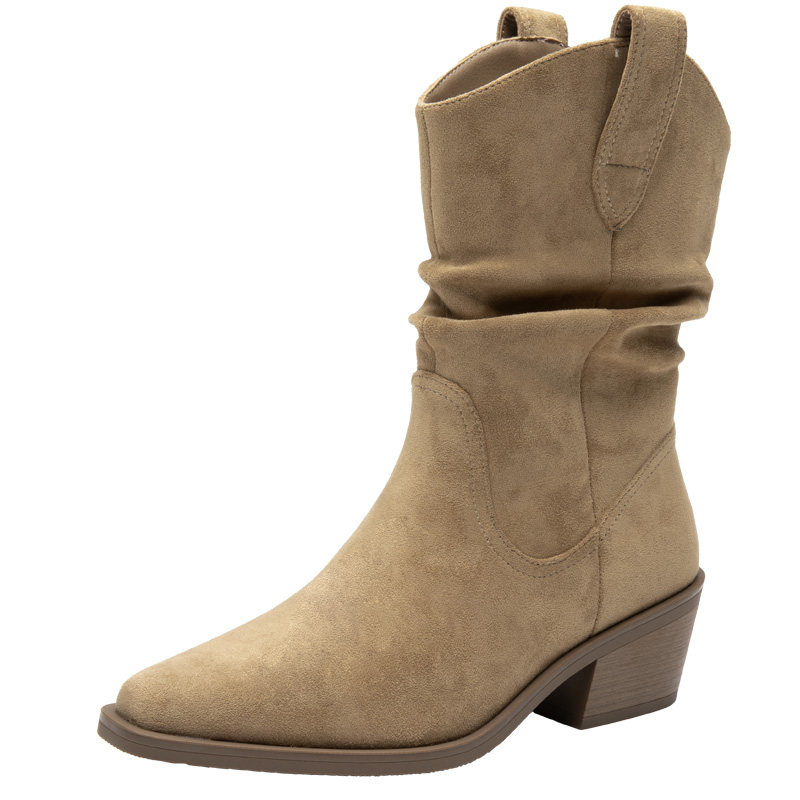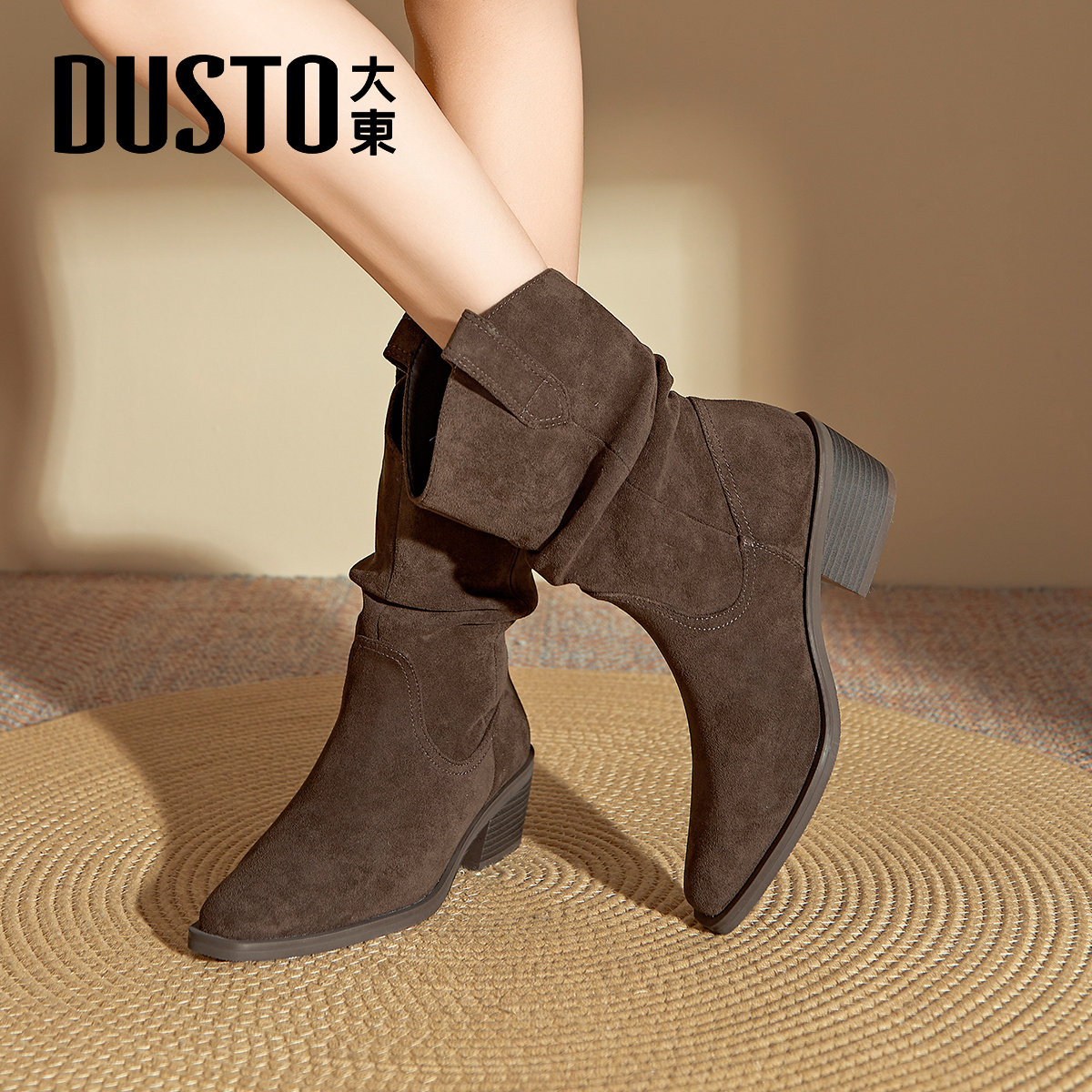 大东官方粗跟堆堆靴女2025新款冬季复古西部牛仔靴加绒骑士靴短靴