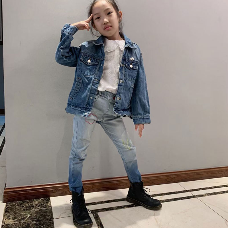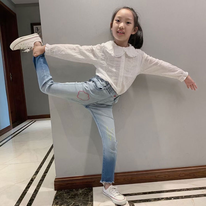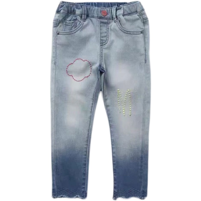韩版春秋款女童水洗磨白弹力修身小脚裤刺绣云朵做旧牛仔裤长裤子