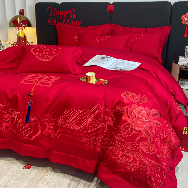 高档简约结婚四件套大红色牀单被套全棉纯棉婚庆牀上用品婚房陪嫁