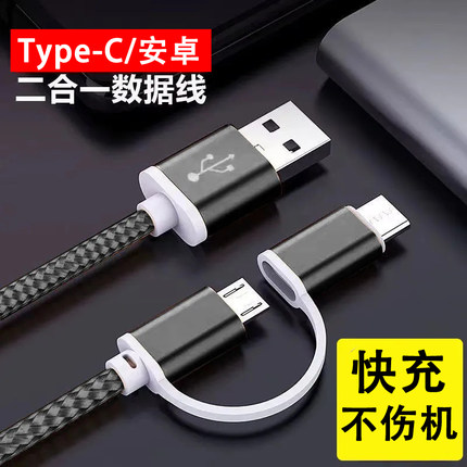 艾胜者 二合一数据线快充一拖二充电线加长Type-C适用华为荣耀vivo小米红米魅族oppo安卓micro USB多功能多头