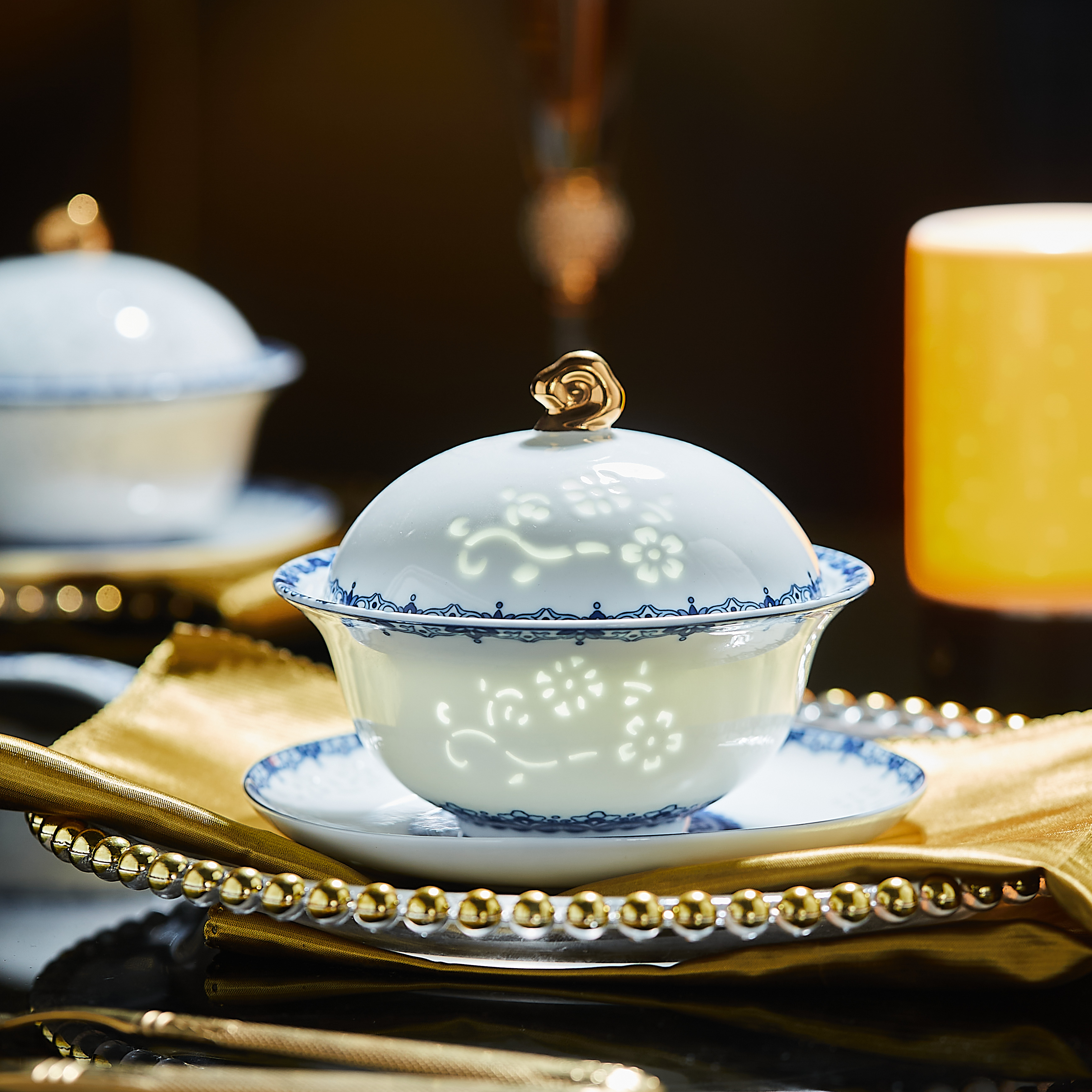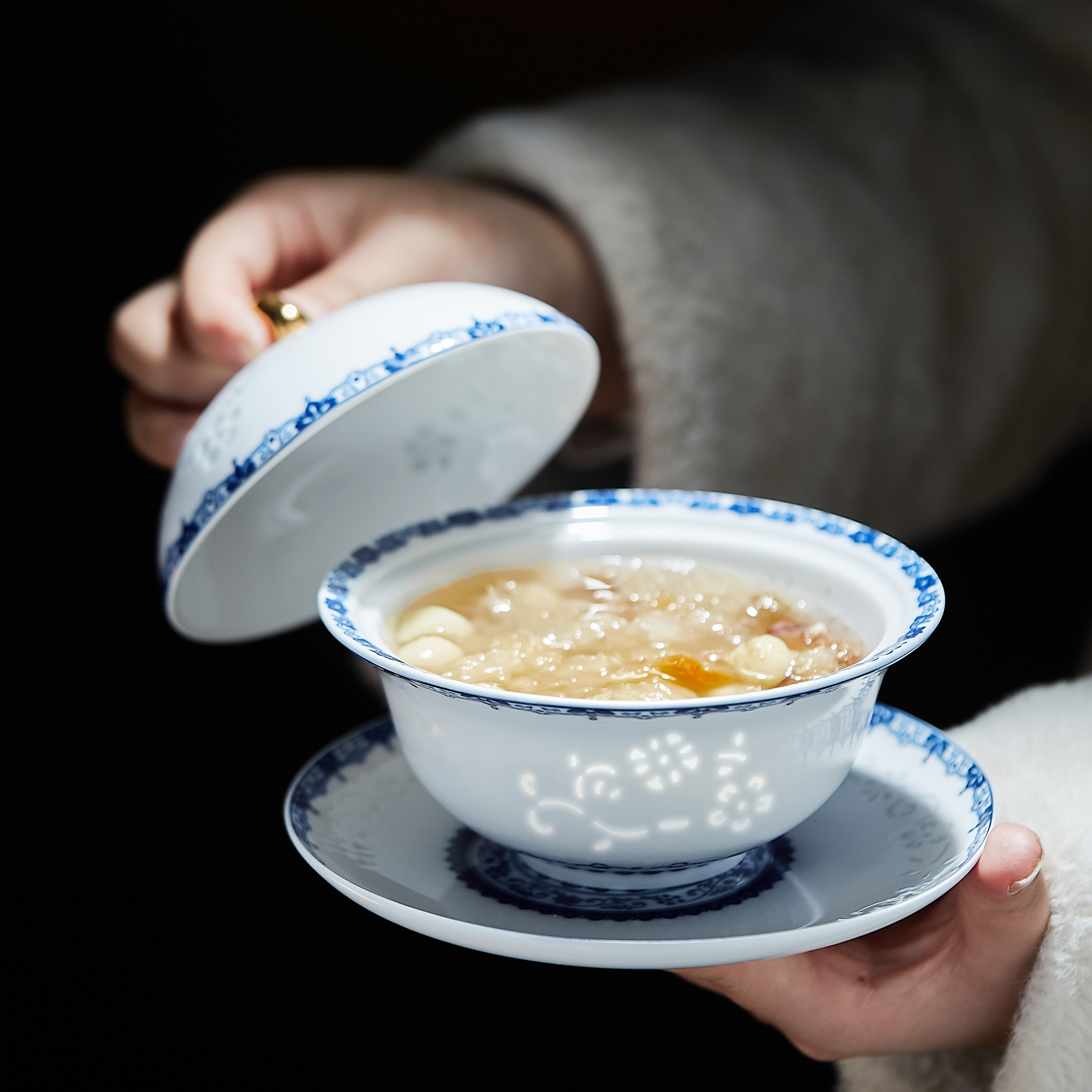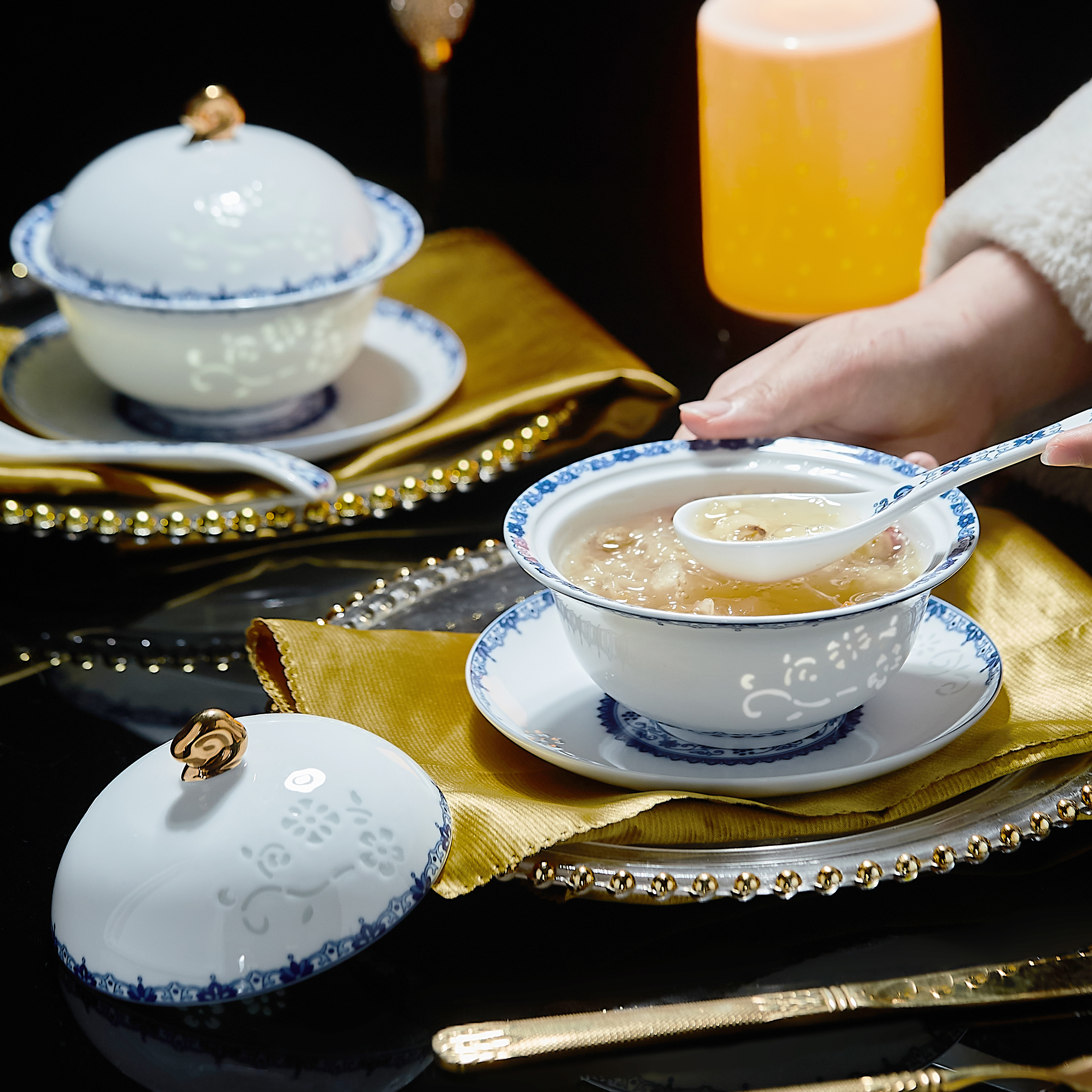 陶北川釉下彩青花玲珑炖盅套装商用会所酒店陶瓷餐具景德镇