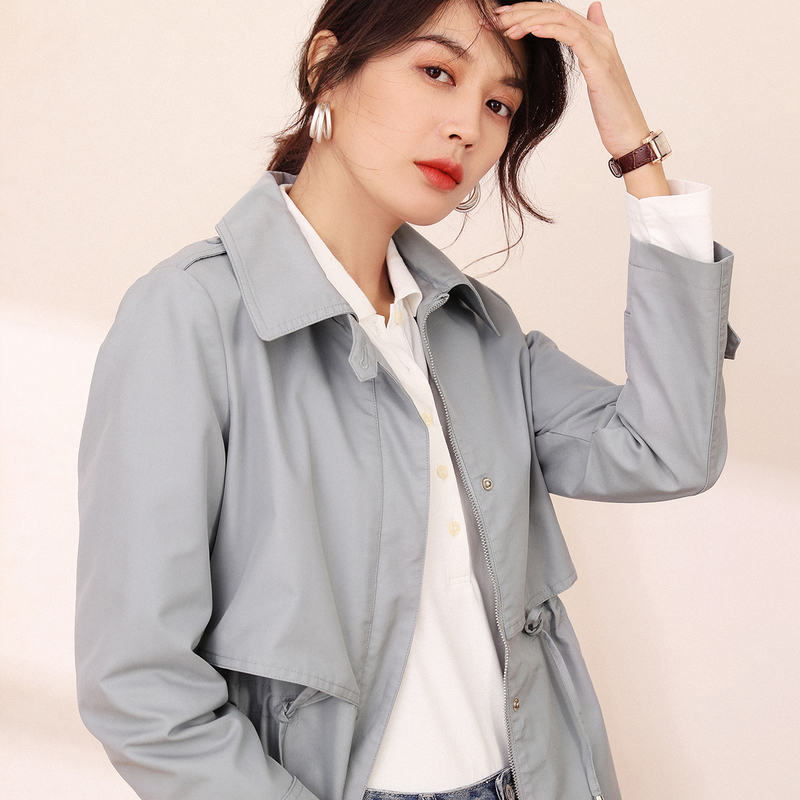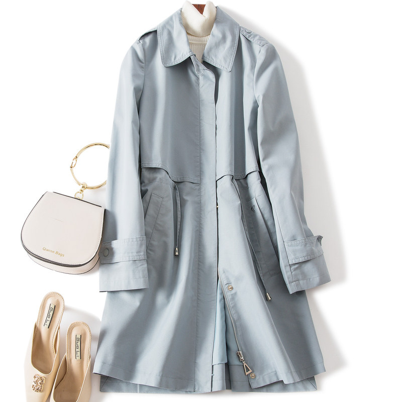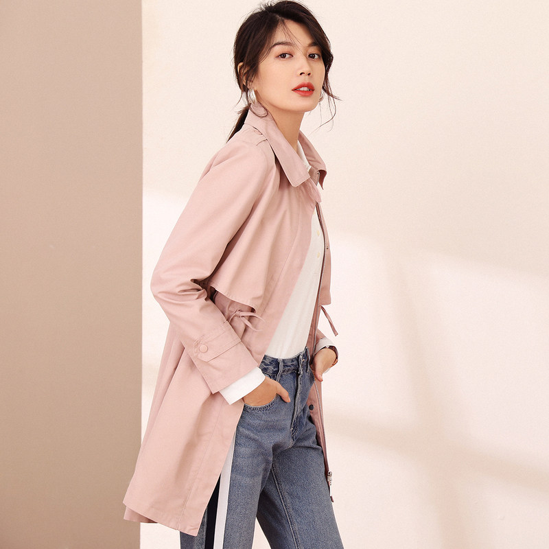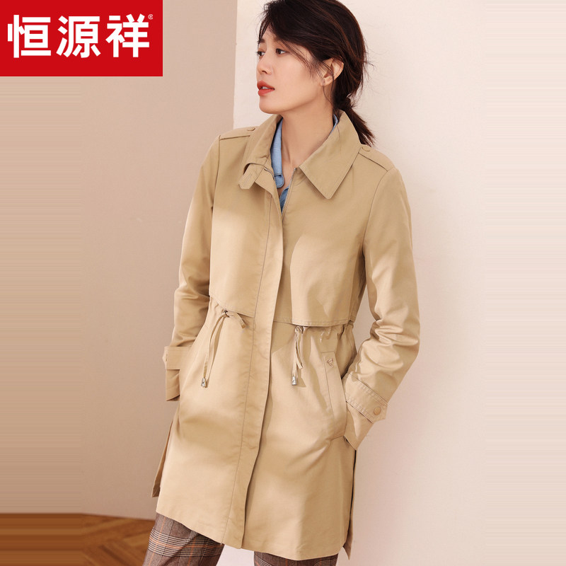 恒源祥休闲风翻领风衣女休闲百搭春秋中长款拉链收腰长袖外套