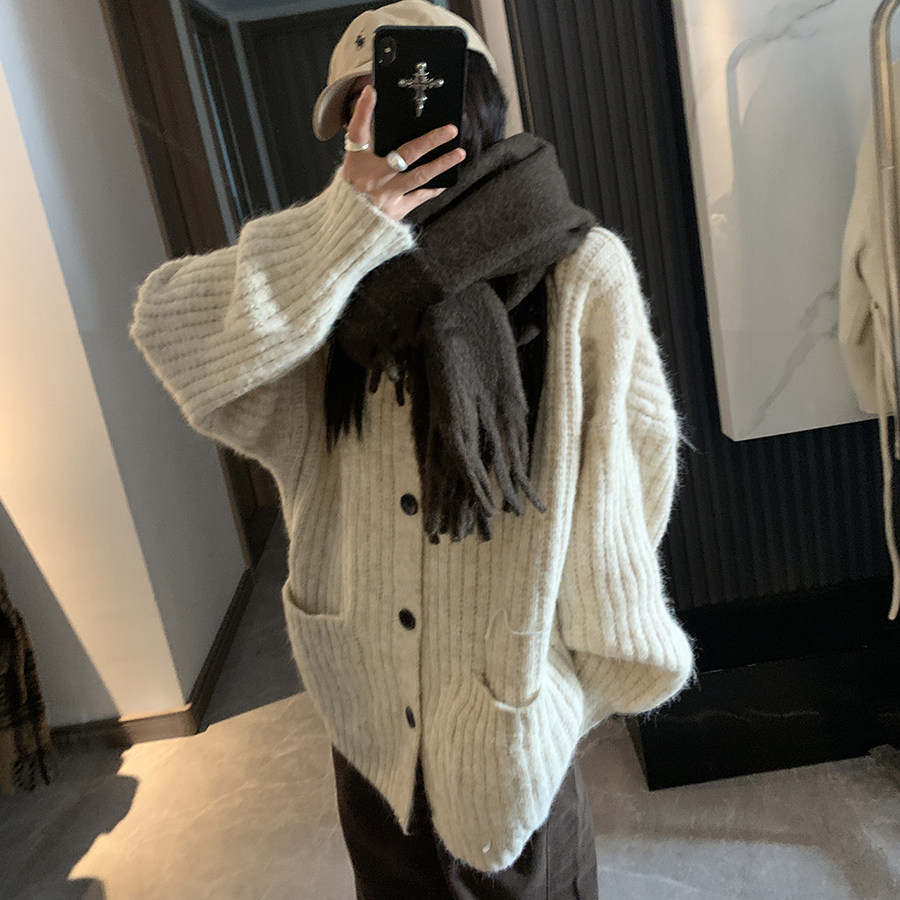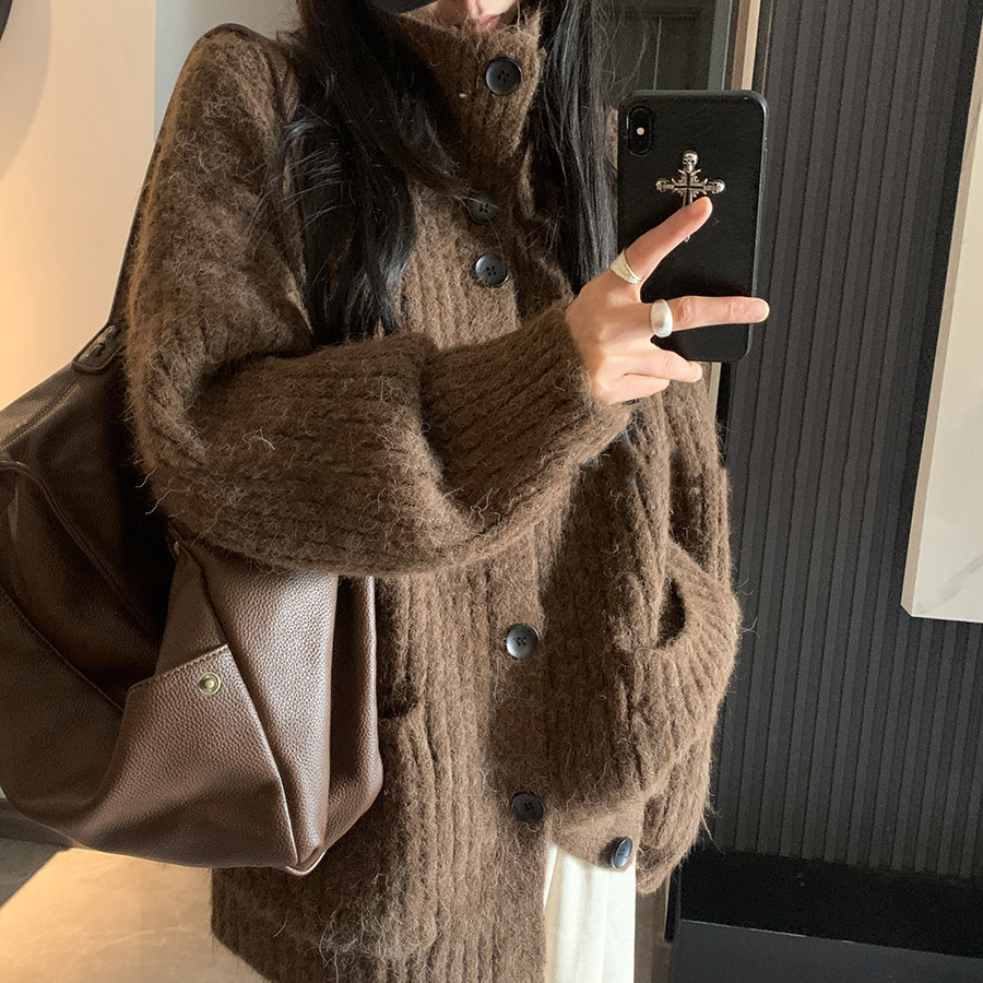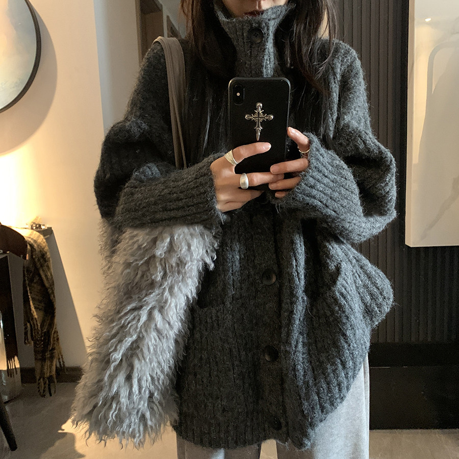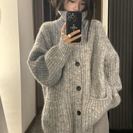 韩系灰色软糯高领开衫毛衣外套女秋冬外穿慵懒风宽松中长款针织衫