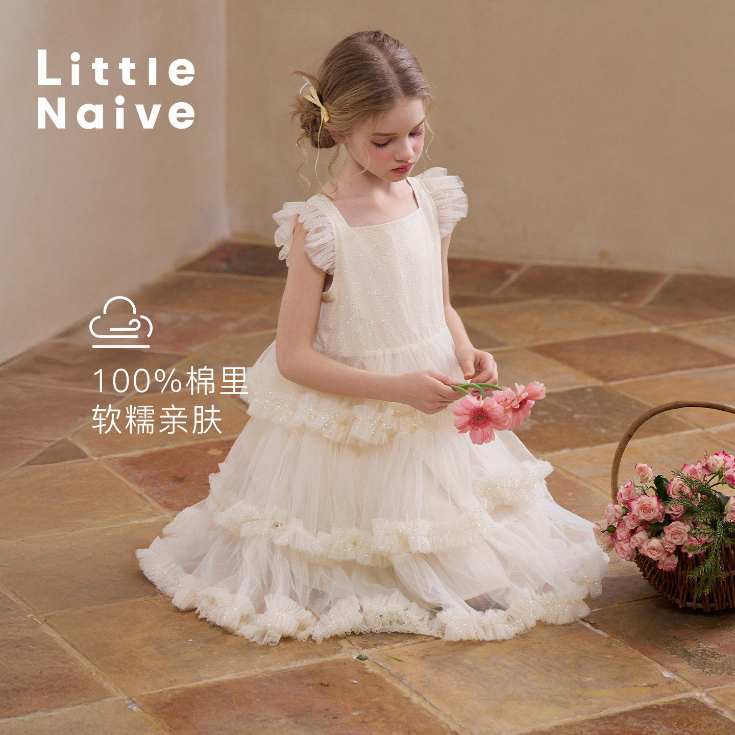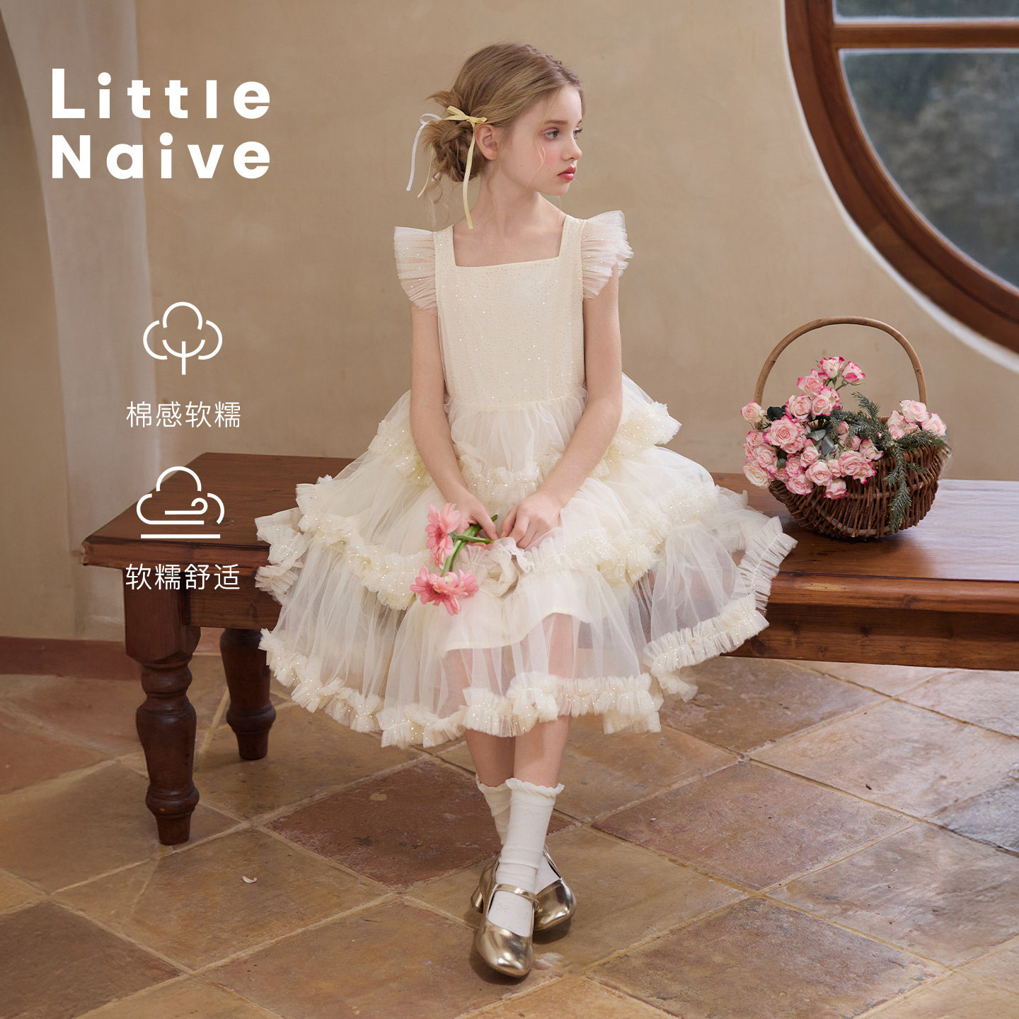 LittleNaive儿童背心裙夏飞袖网纱纯色法式无袖公主裙女童连衣裙