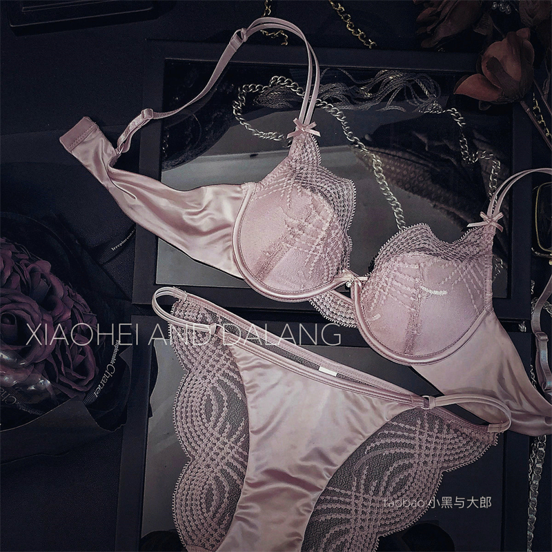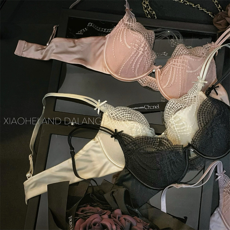 小胸聚拢蕾丝刺绣内衣女2025新深V镂空大胸显小缎面性感文胸套装