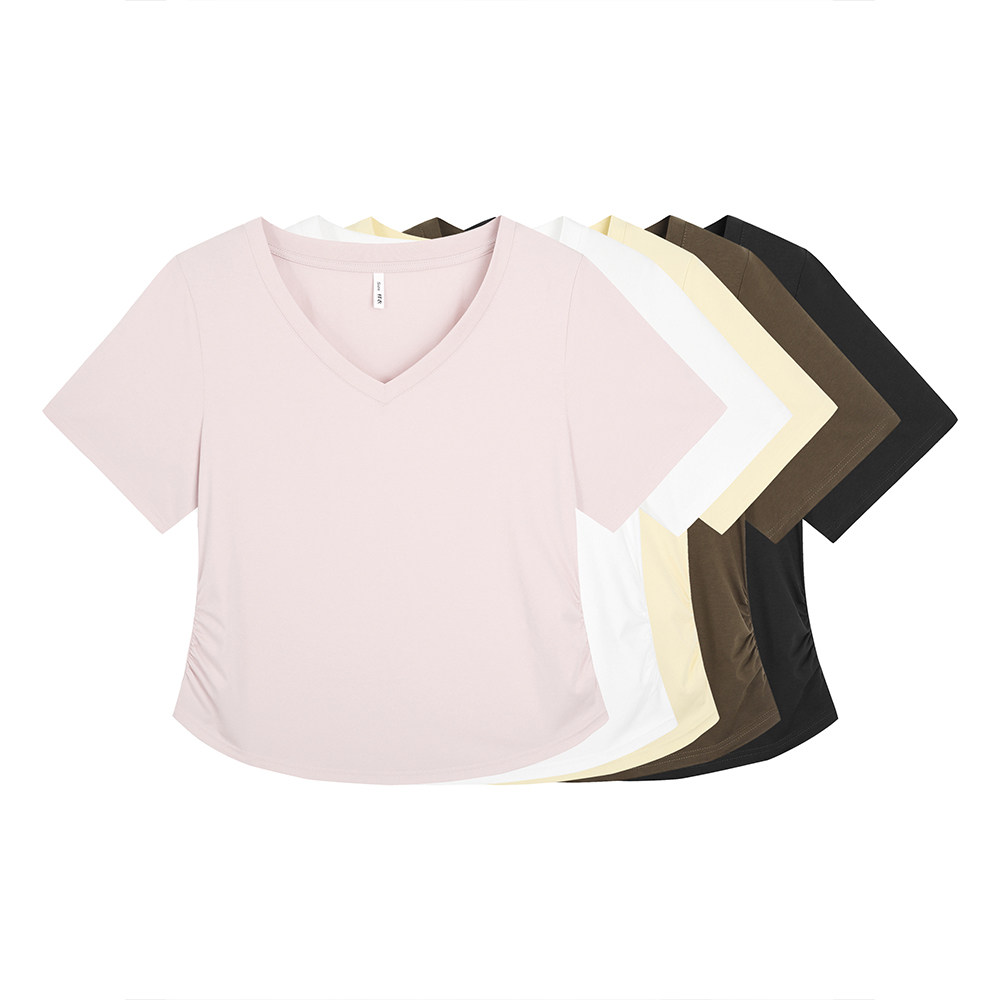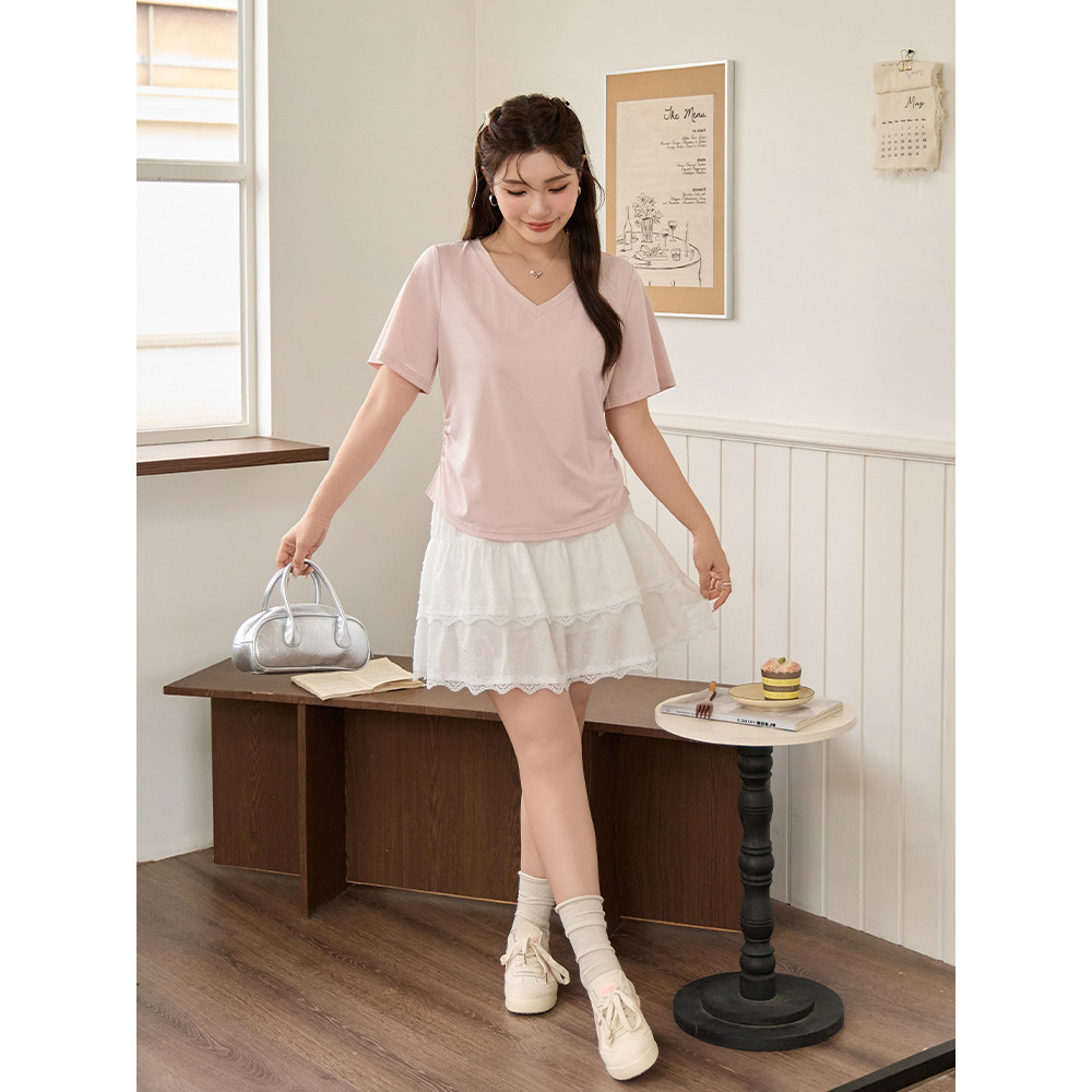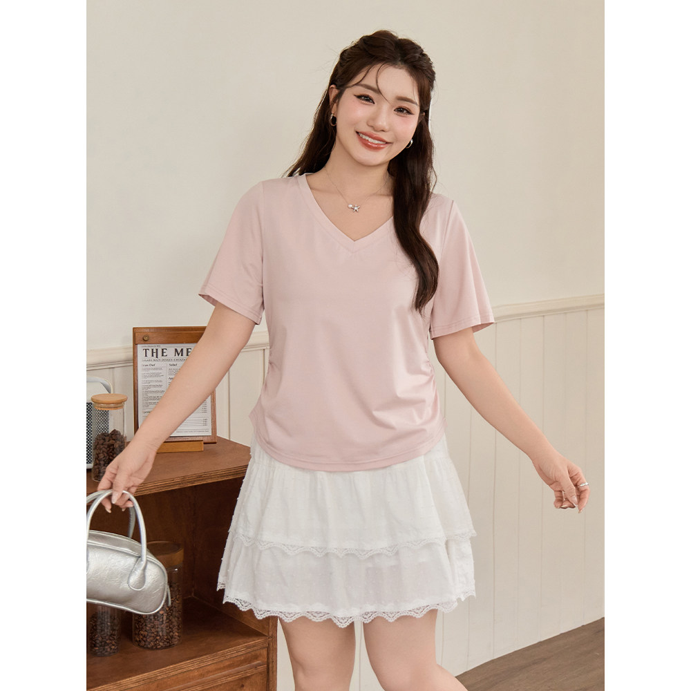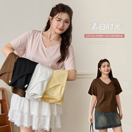 小波家2026夏季新品胖mm韩系简约纯色上衣正肩V领遮肉显瘦短袖T恤