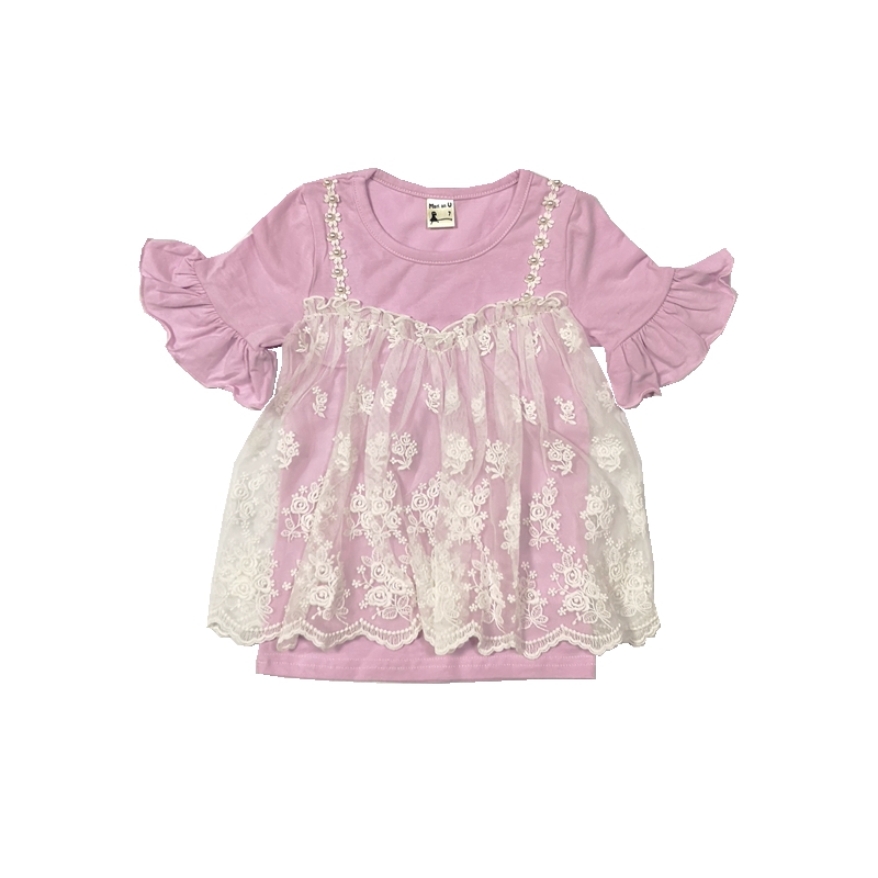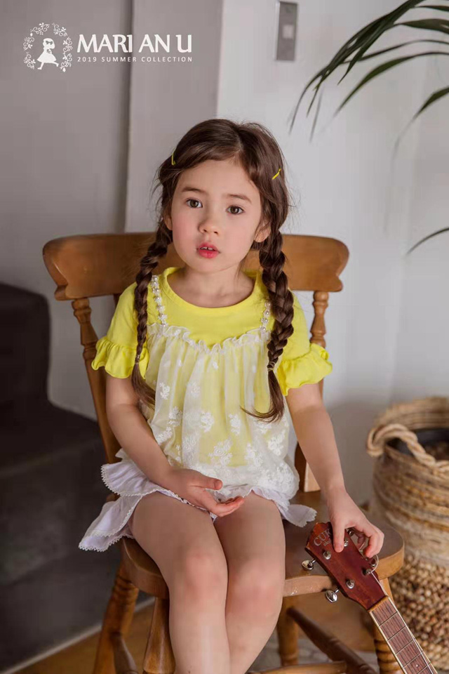 现货馨逸童话屋韩国进口Marianu2019夏女童蕾丝假两件吊带短袖T恤