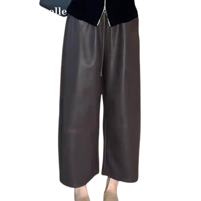 拉夏贝尔欧货直筒阔腿皮裤女秋冬新款高腰显瘦宽松百搭九分休闲裤