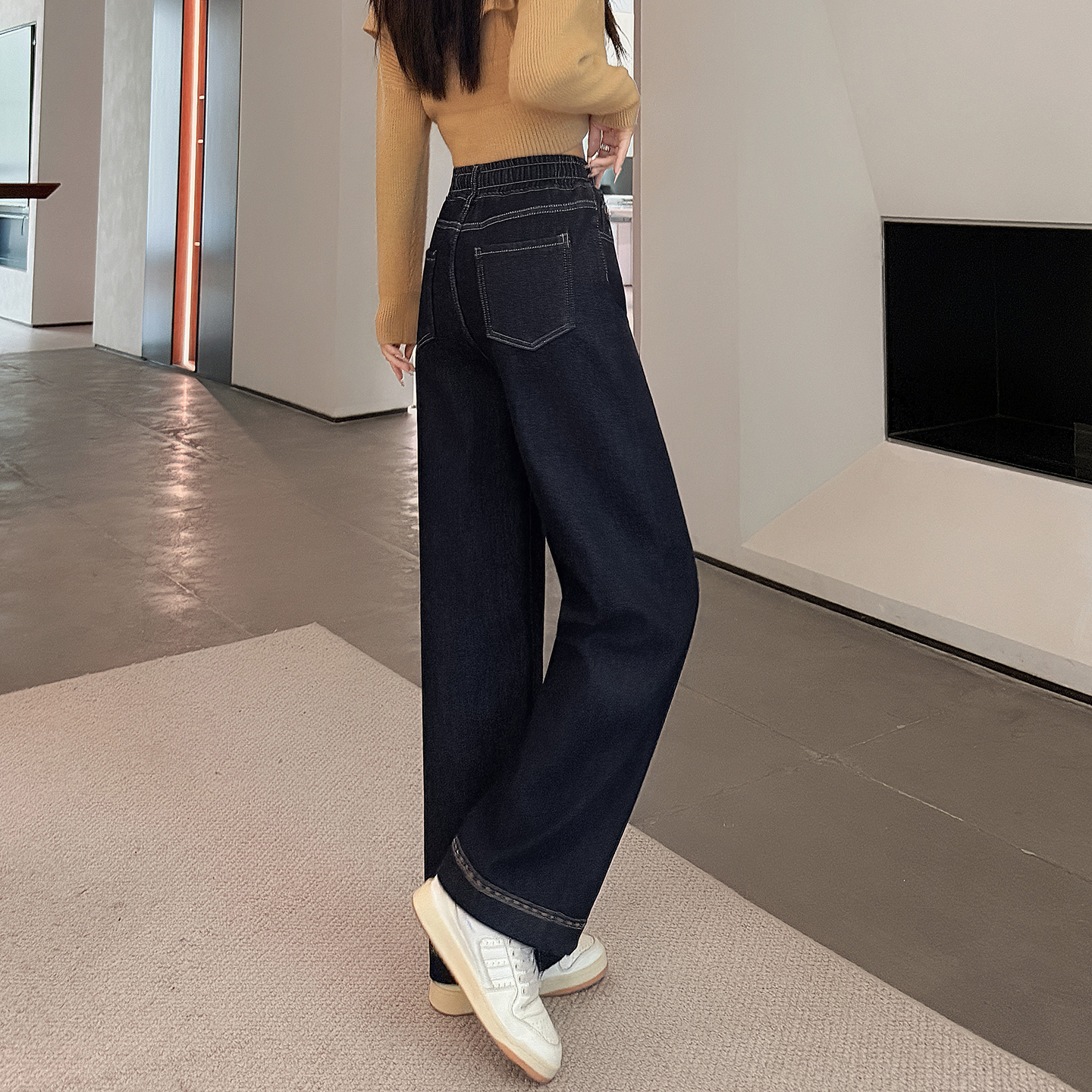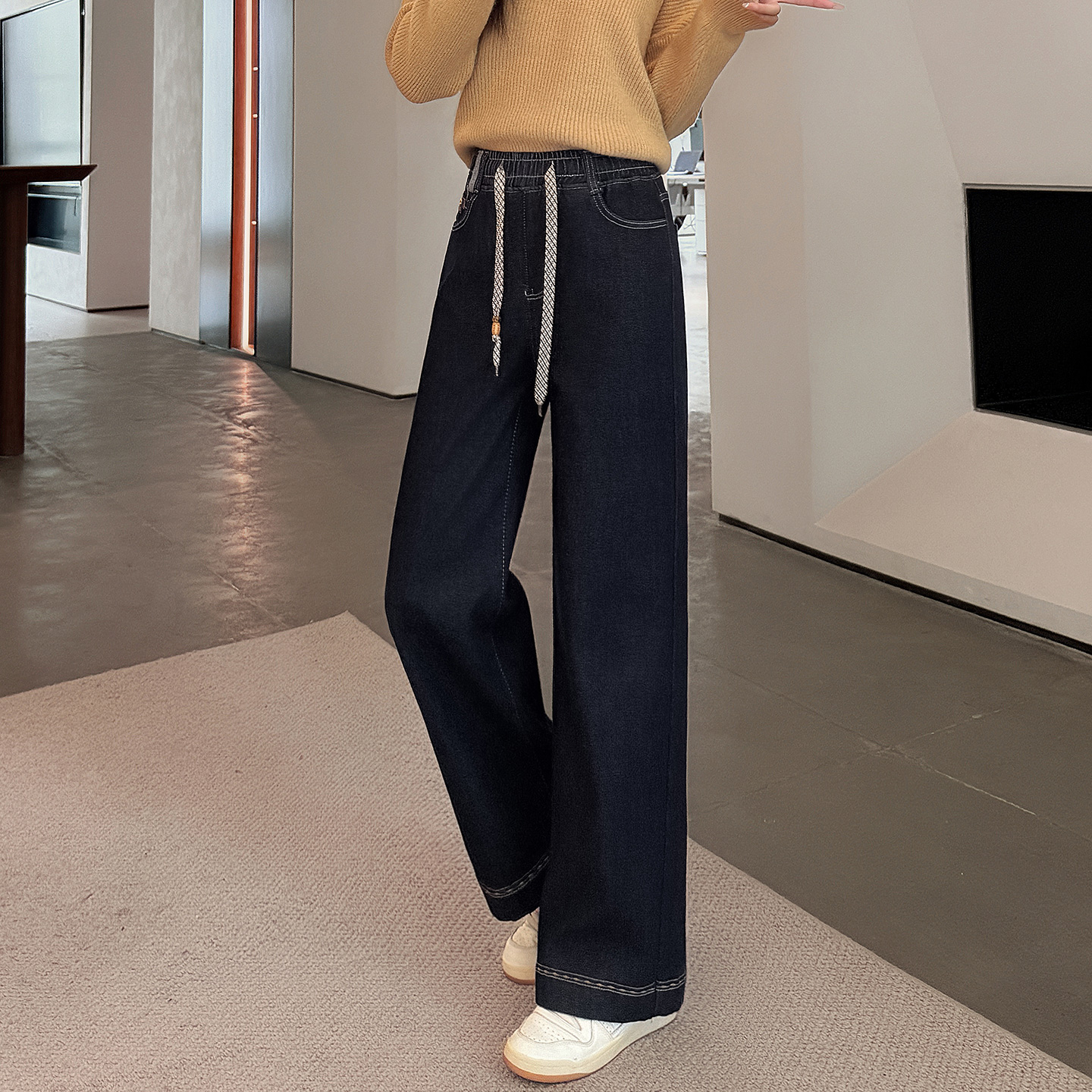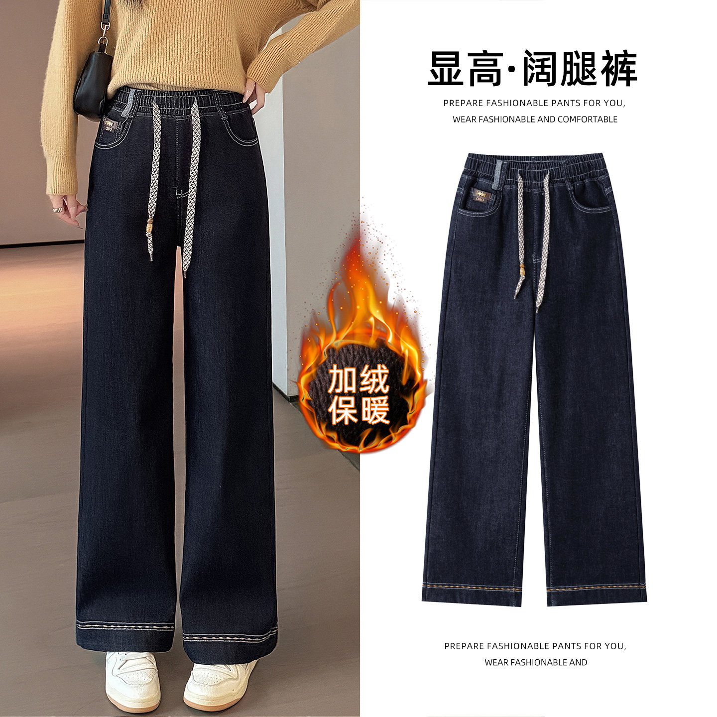 少女直筒牛仔裤弹力阔腿裤2025秋冬加厚加绒初中生宽松中学生长裤