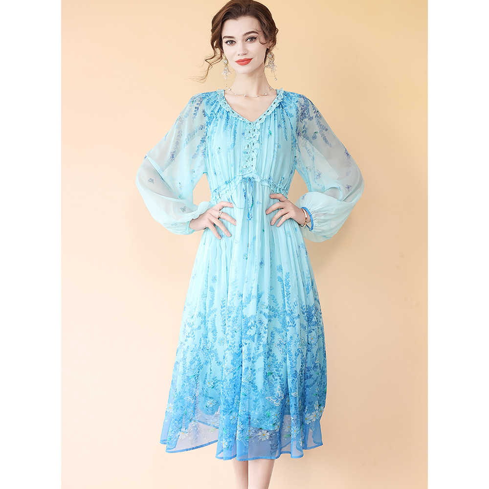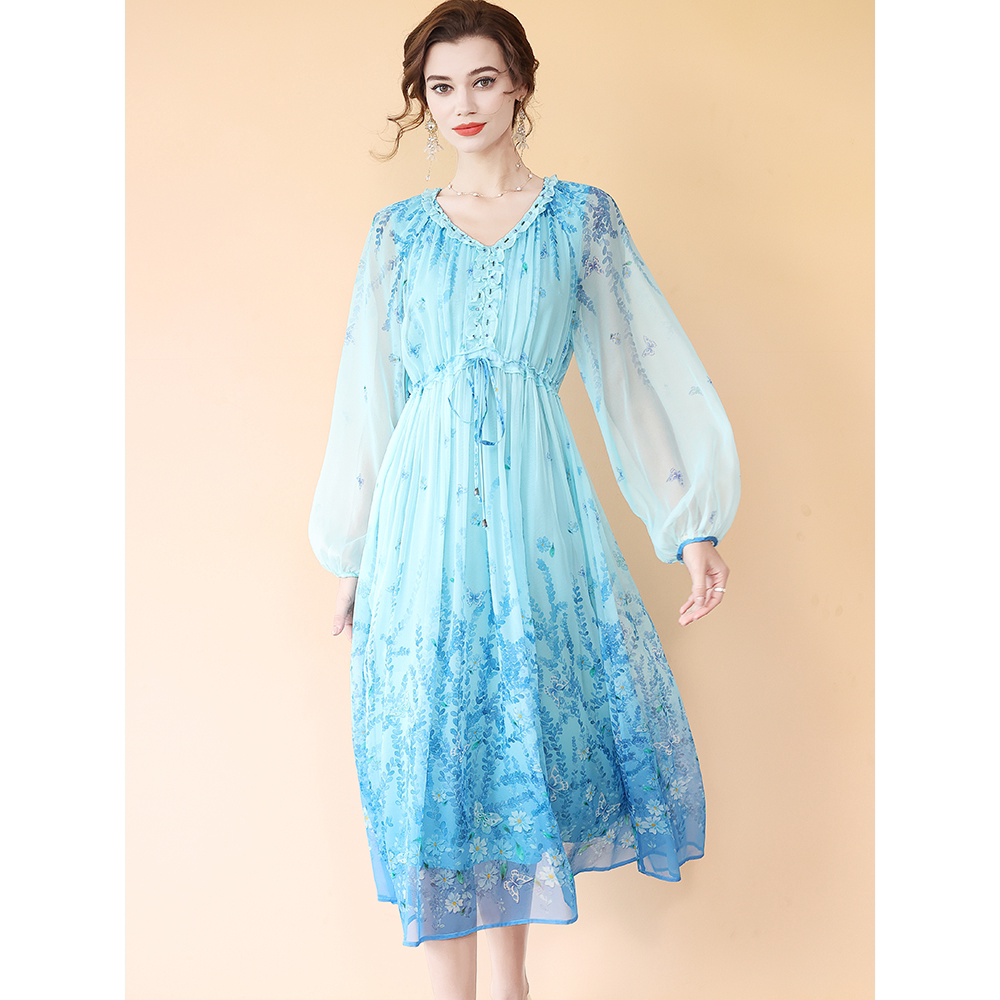 真丝连衣裙2024春新款高级感法式高腰碎花裙高端气质桑蚕丝度假裙