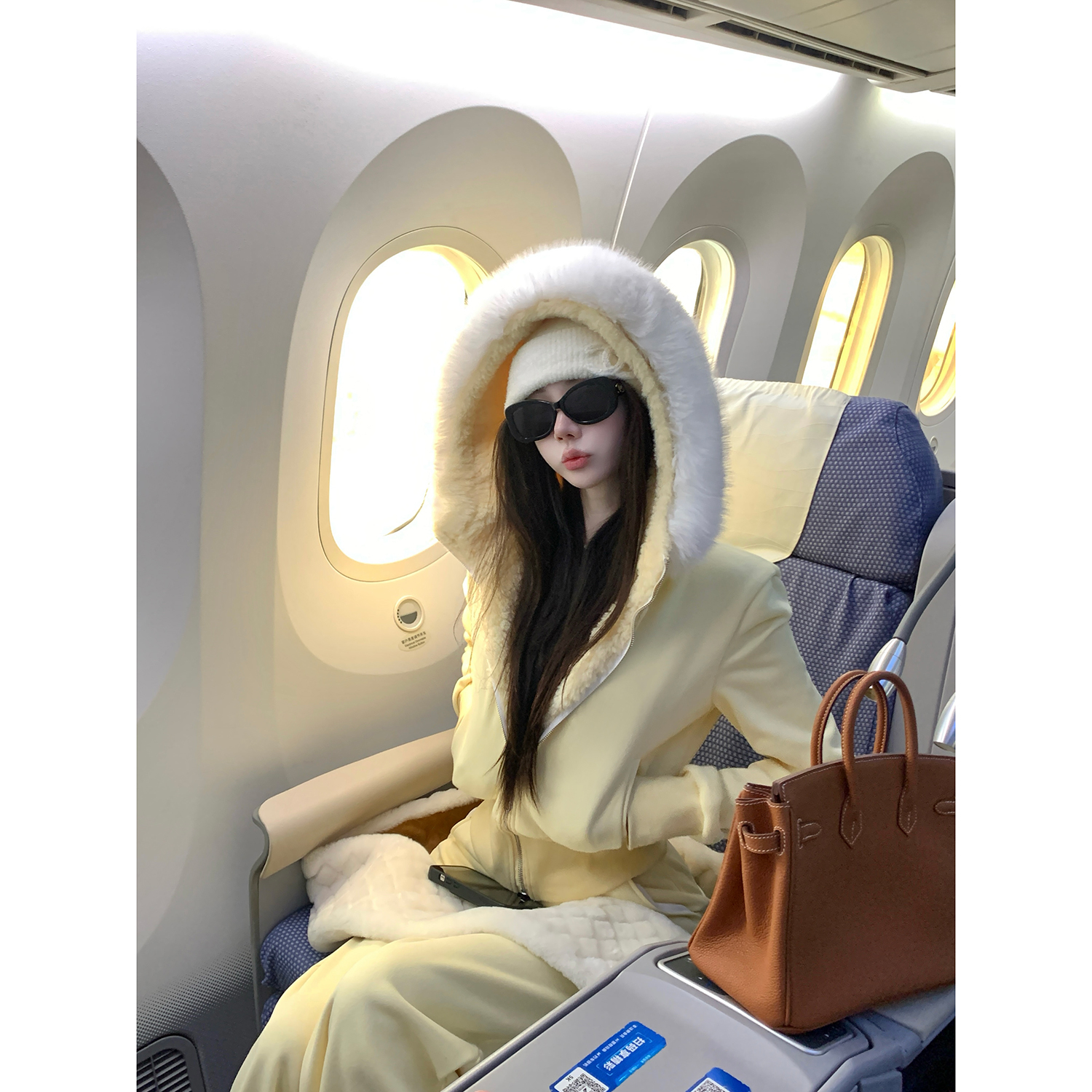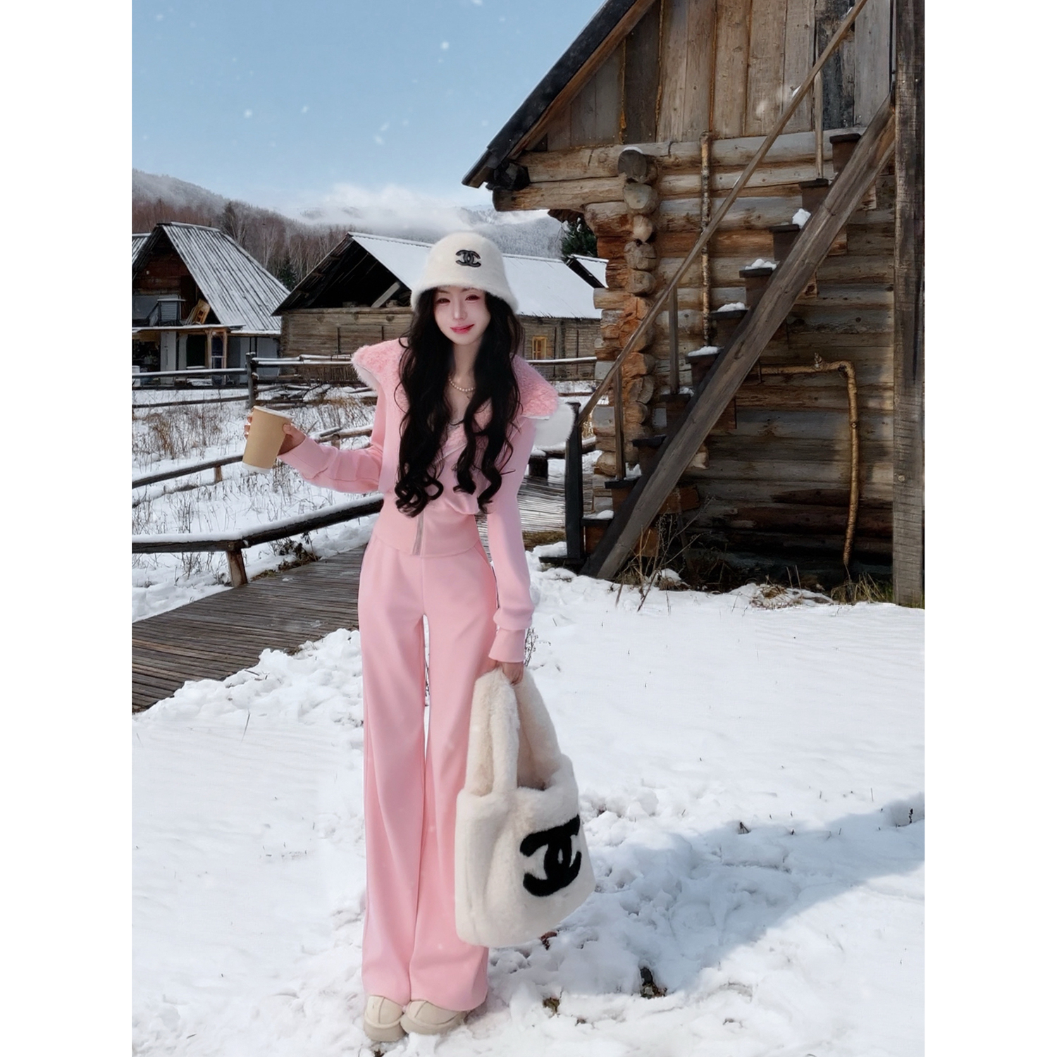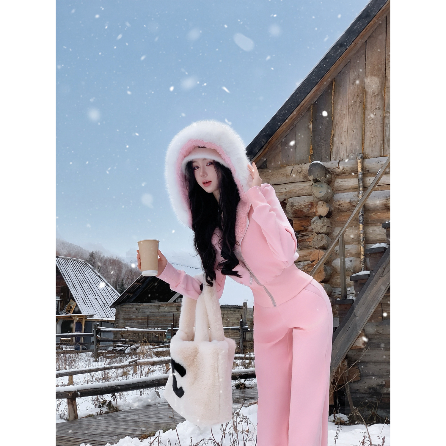 Sun雅乔【樱花奶酪】冬装仿羊羔毛卫衣连帽加绒休闲裤运动套装女