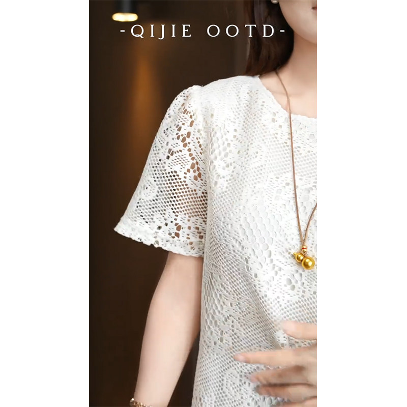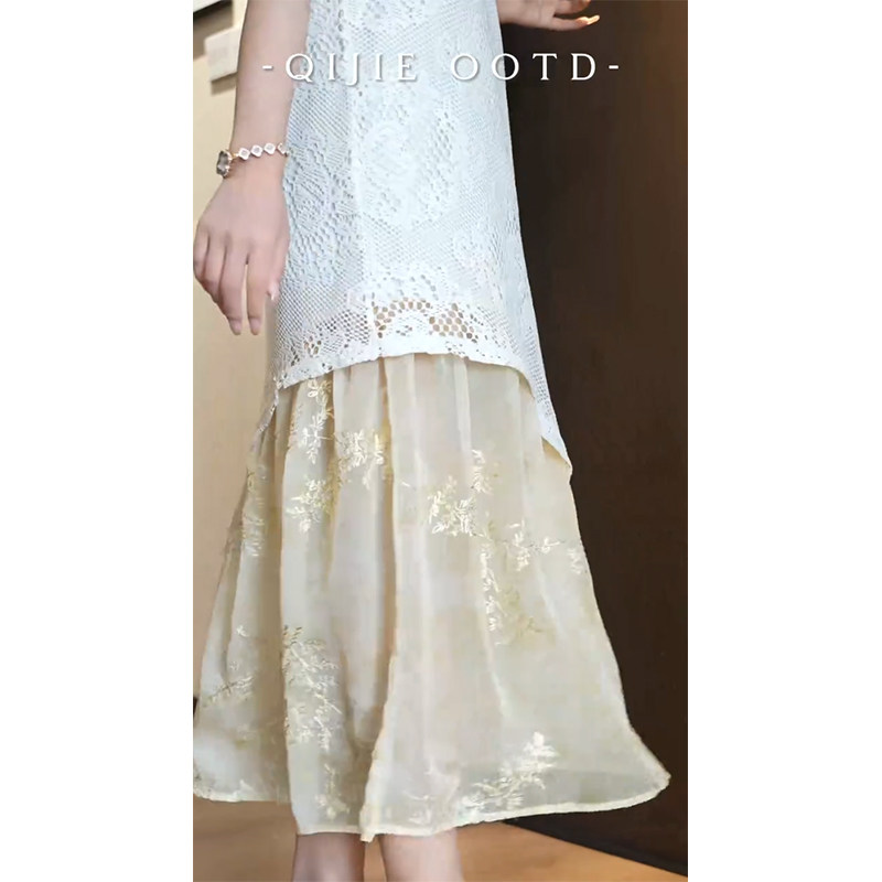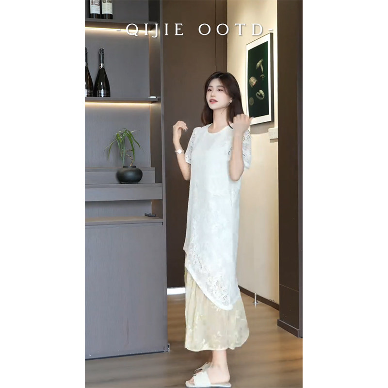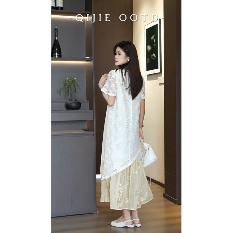 柒院家微胖大码女装设计感拼接镂空连衣裙2025夏遮肉显瘦蕾丝长裙