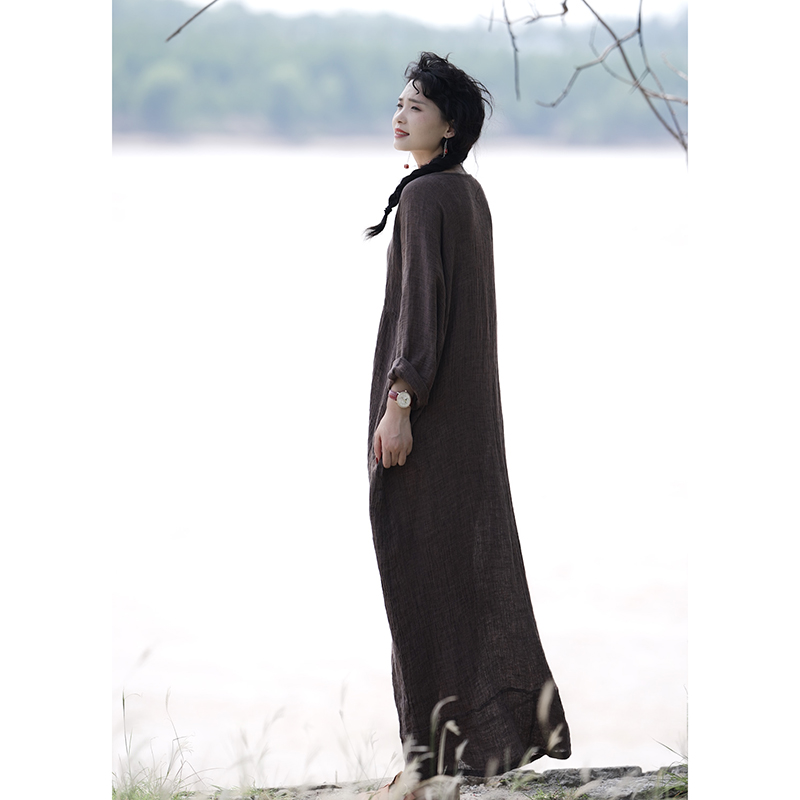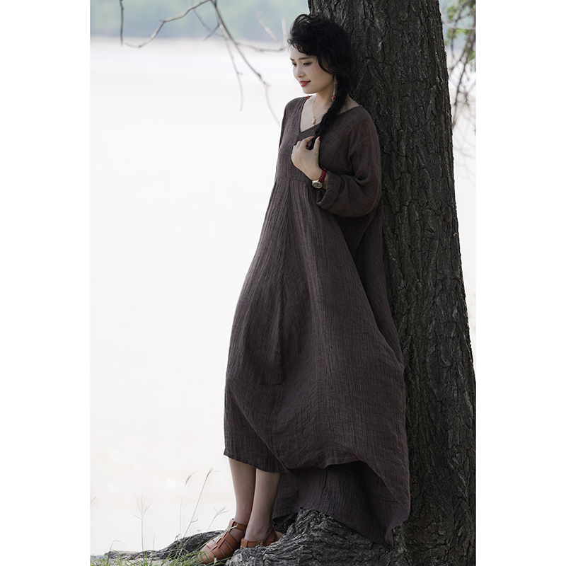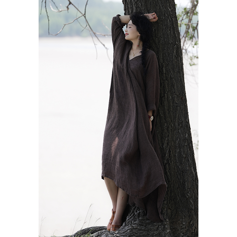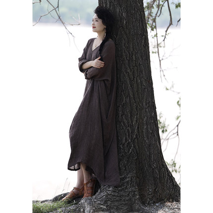 YIMIAN 竹烟波月亚麻慵懒风褶皱高腰v领定制气质连衣裙2094