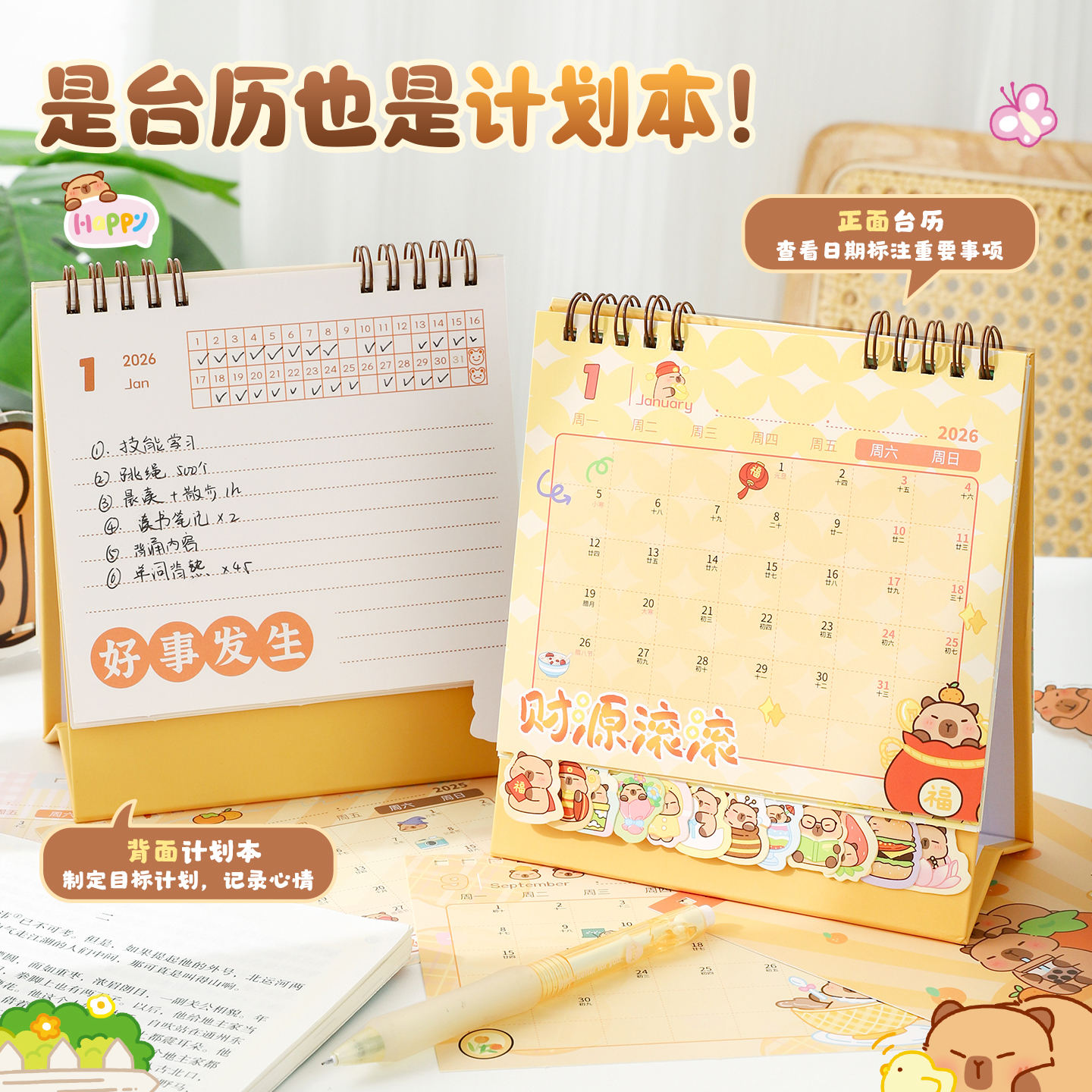 台历2026年新款日历卡皮巴拉桌面创意摆件可爱卡通学生记事本马年商务办公全年月历日程打卡计划本考研备忘录
