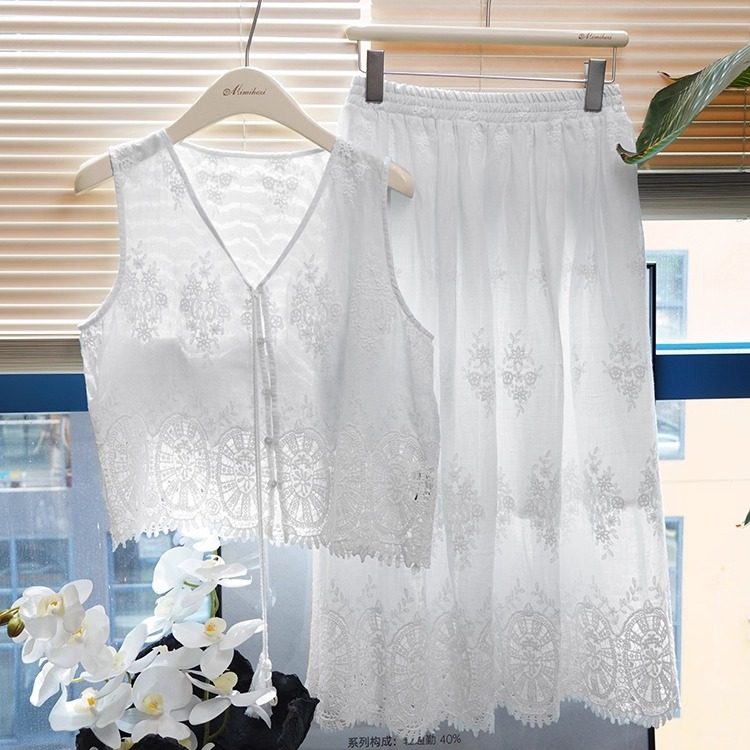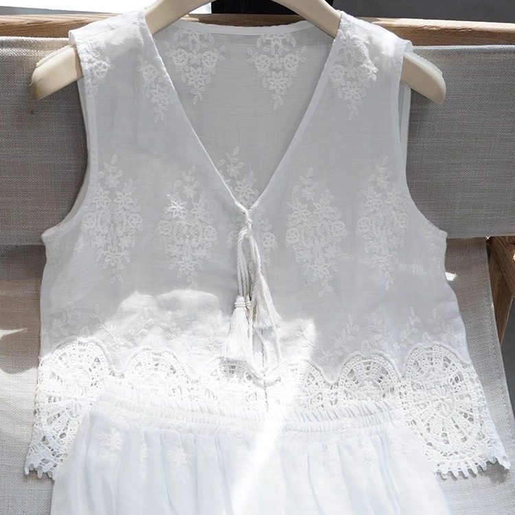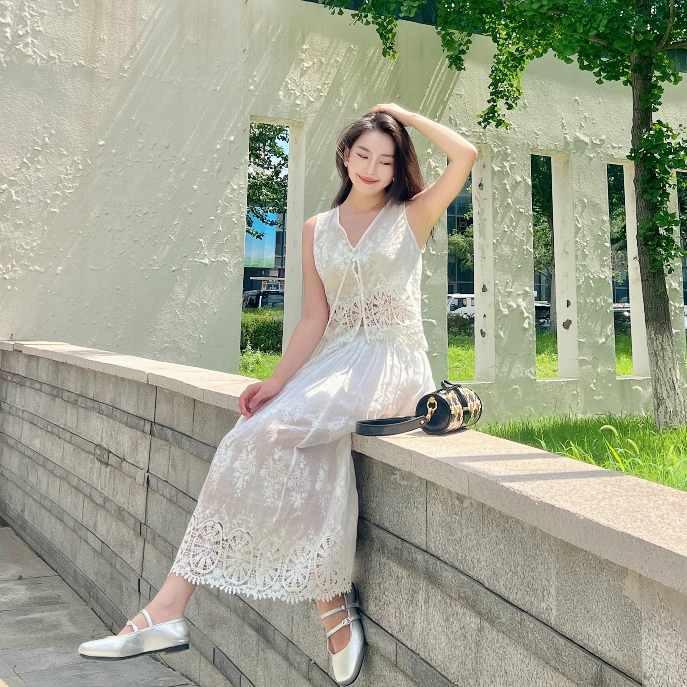 秘密盒子凯瑟琳 全件重磅精致亚麻刺绣花边绑带背心半身裙套装