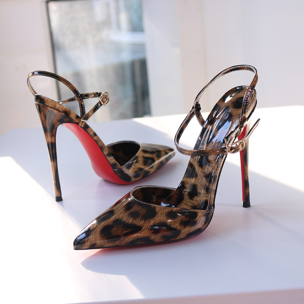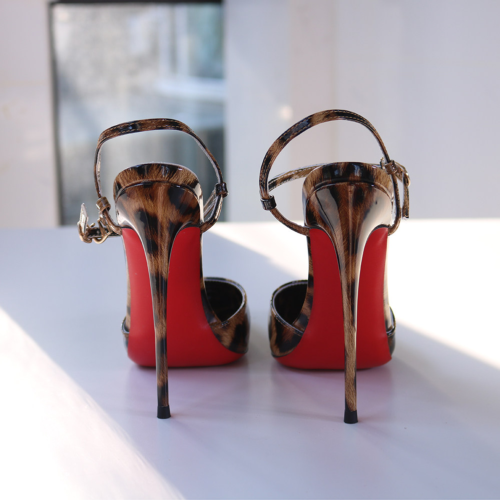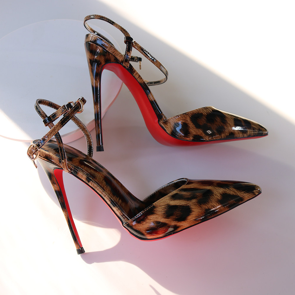 红底豹纹高跟凉鞋一字式搭扣细跟尖头欧美风性感夜店大码反串13CM