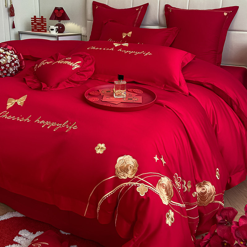 大红色婚庆四件组全棉100新婚床单M盖被套结婚房喜庆床上