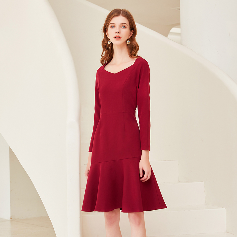 映想社交女装秋季酒红色长袖连衣裙荷叶边小红裙