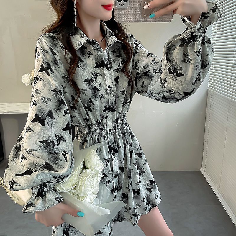 设计感皱褶松紧腰中长款上衣女遮屁股洋气漂亮印花衬衣喇叭袖衬衫