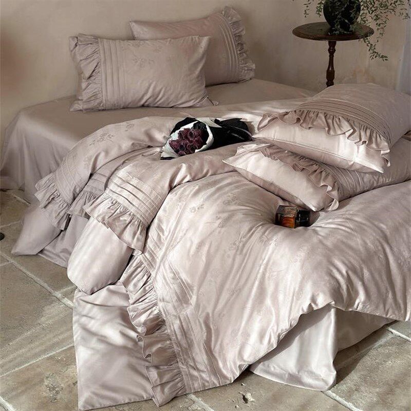 落日玫瑰法式提花100支w长绒棉四件套公主风花边全棉床单被套