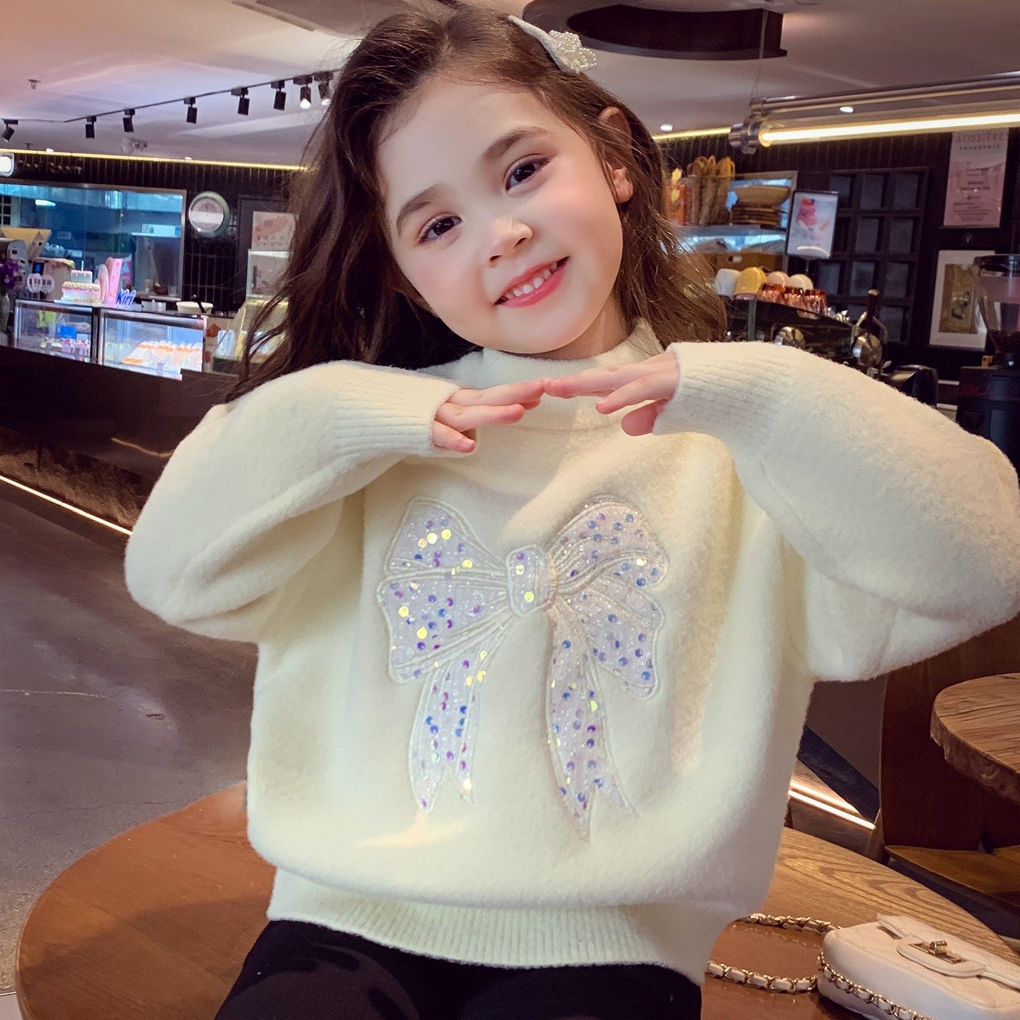 女童红色毛衣冬装2025新款儿童韩版亮片蝴蝶结套头针织衫女孩上衣