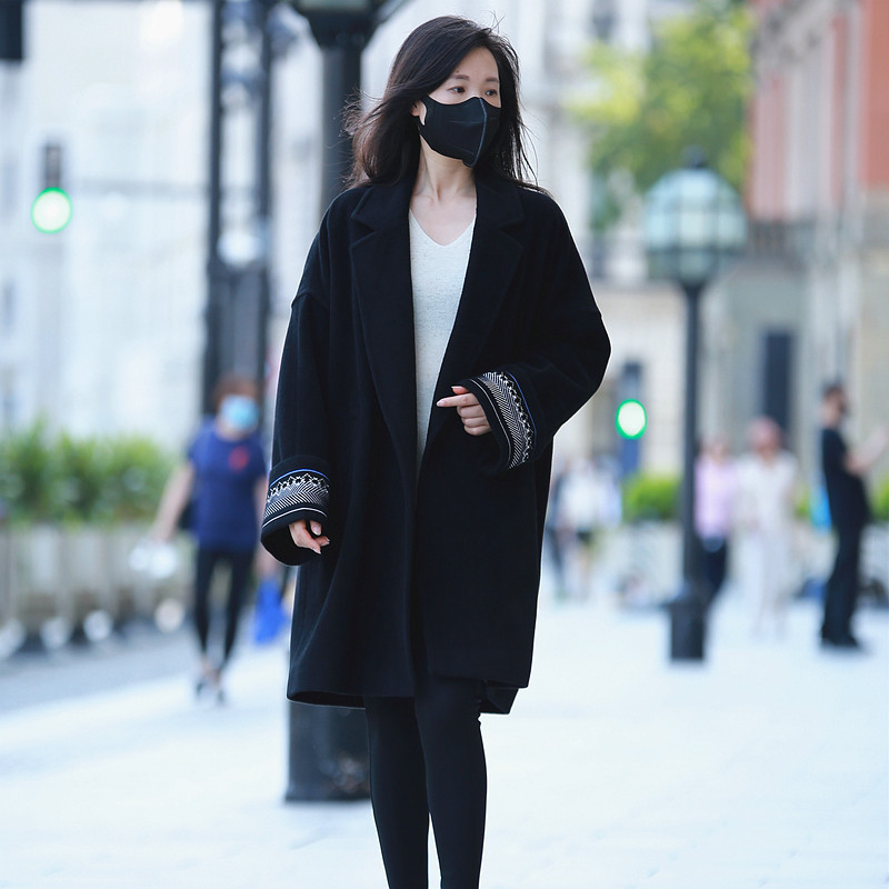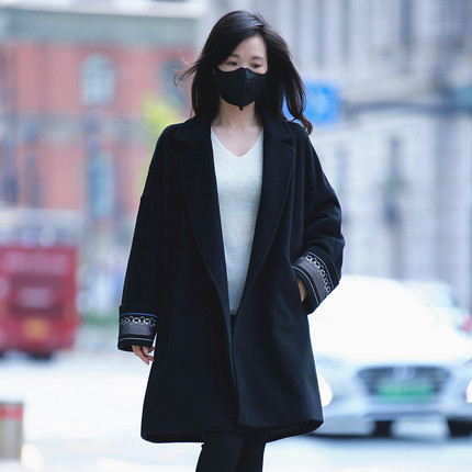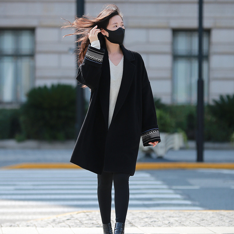 2025秋冬刺绣双面羊绒羊毛大衣女中长款气质宽松黑色呢子外套