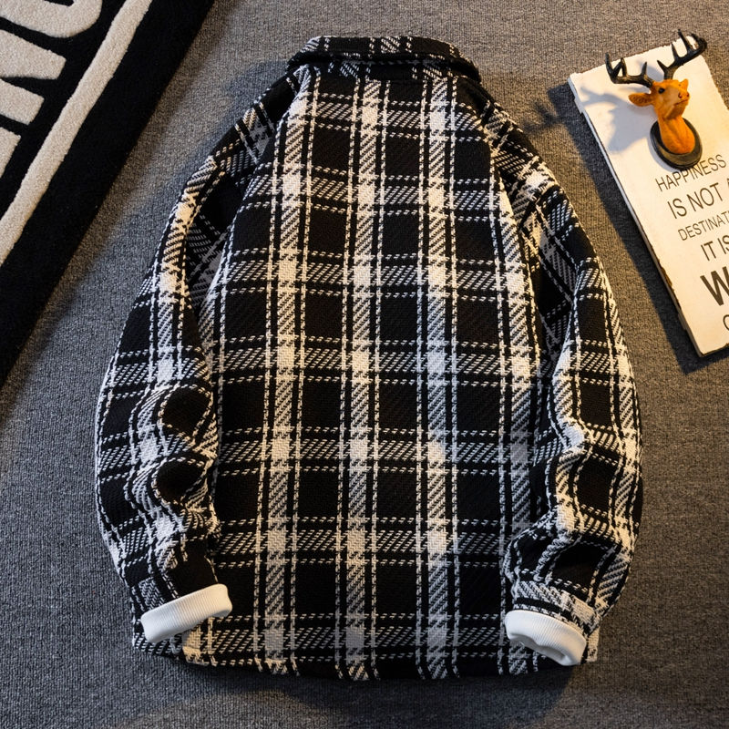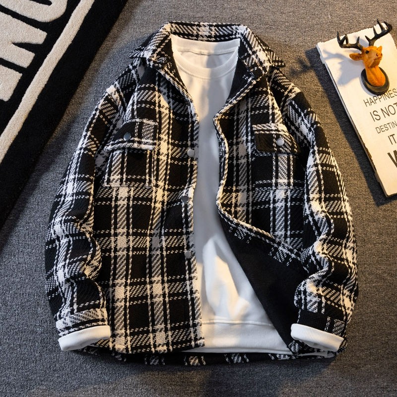 加绒毛呢外套男格子衬衫加厚工装夹克小香风潮牌情侣休闲针织上衣
