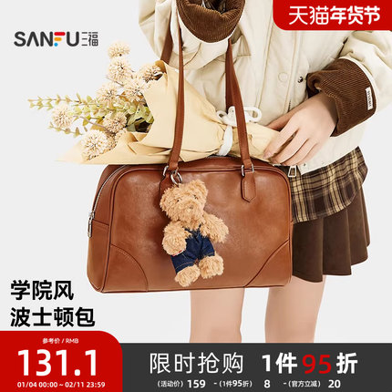 三福挎包冬季学院老钱风波士顿包小熊挂件美拉德时尚女包505114