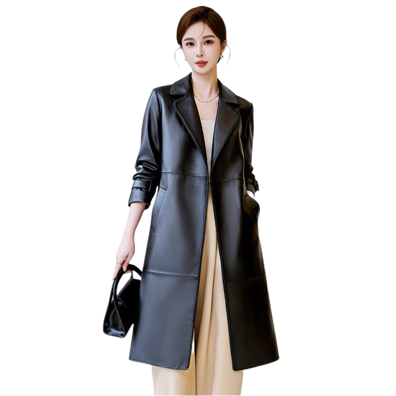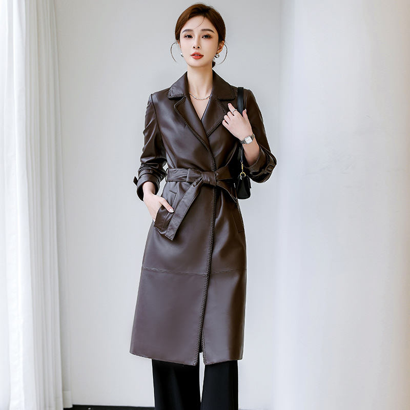 海宁真皮绵羊皮2025春秋季新款中长款重工编织时尚无扣风衣皮衣女