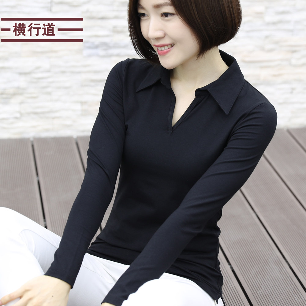 春装新款有领衬衫领大码女装简约职业装v领长袖t恤带领纯色打底衫